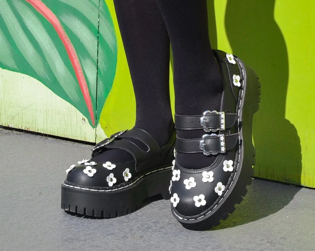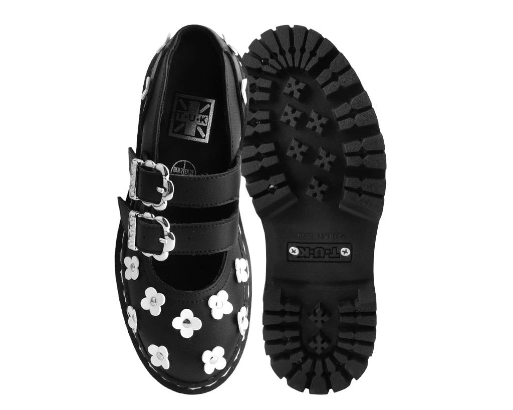 These platform Mary Janes add the perfect edge to any outfit. Has a black upper made of our high quality TUKskin™ material — polishable synthetic faux leather that is both soft and breathable. Features flower details and a platform height that stands at 2” with screws in the sole for extra allure. Comes with removable memory foam insoles for added comfort.