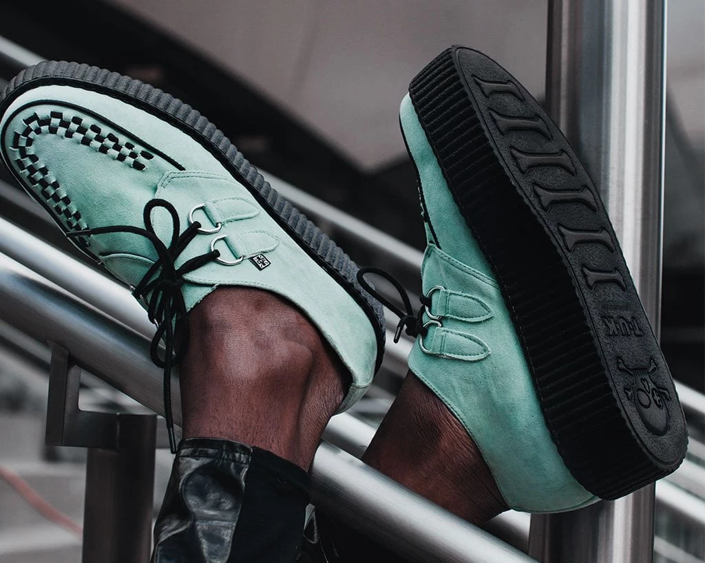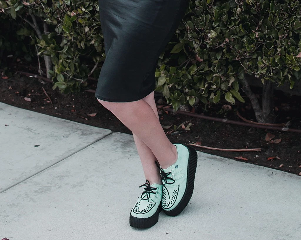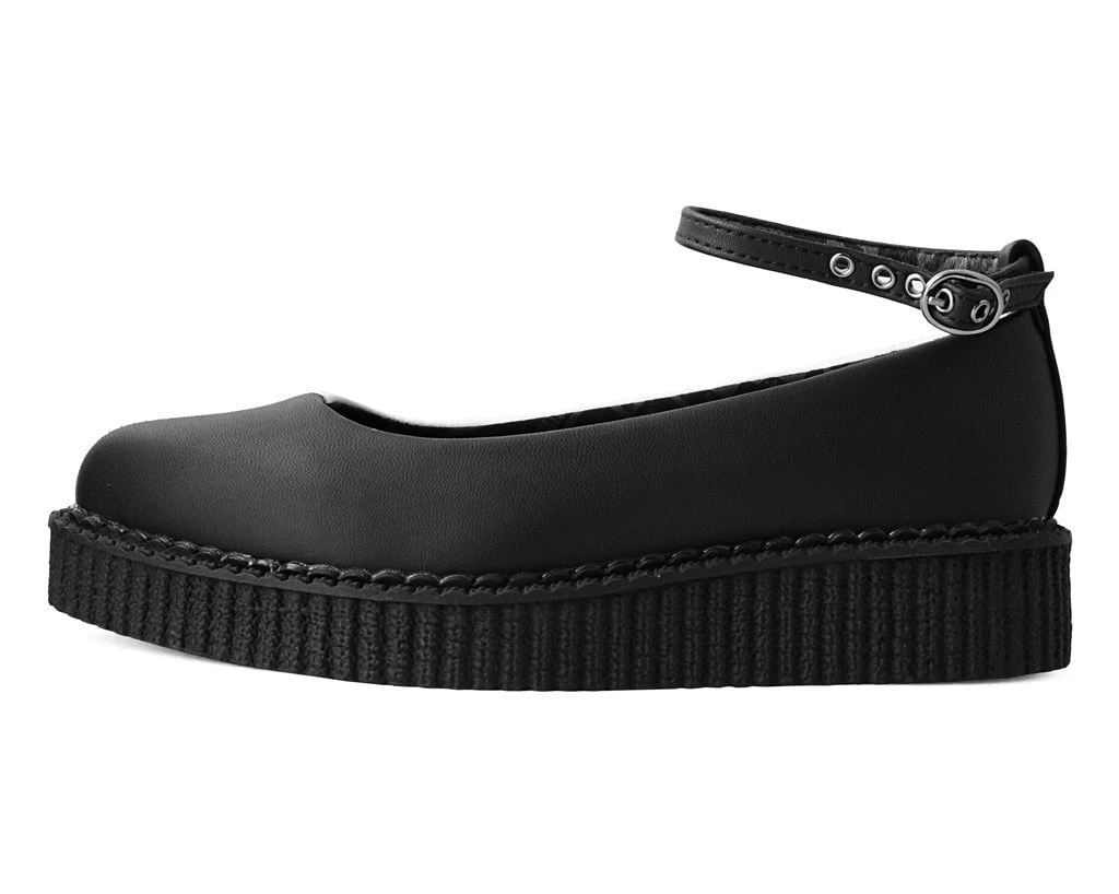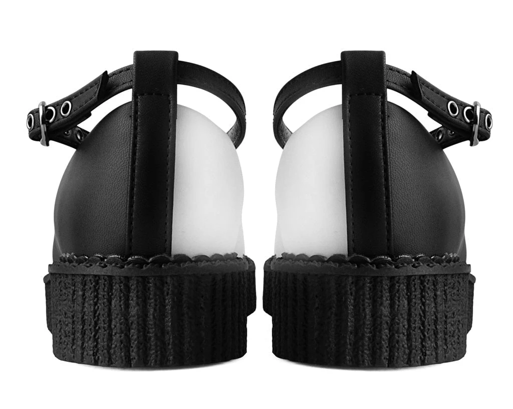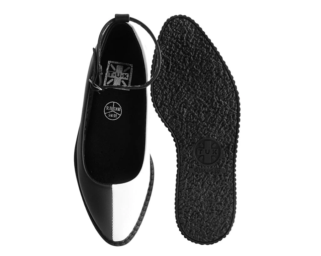 You can refer to these as your dream shoes. Features a two-tone black & white TUKskin(tm) upper with pointed toe construction and ankle strap closure for an adjustable fit. Sits on top of a low sole creeper platform that measures 1 1/4” at the heel and 3/4” in the front. Has removable memory foam padding for added comfort.