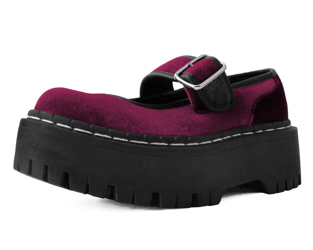 These platform Mary Janes add the perfect edge to any outfit. Has an eye-catching burgundy velvet upper. Features a platform height that stands at 2” with screws in the sole for extra allure. Comes with removable memory foam insoles for added comfort.