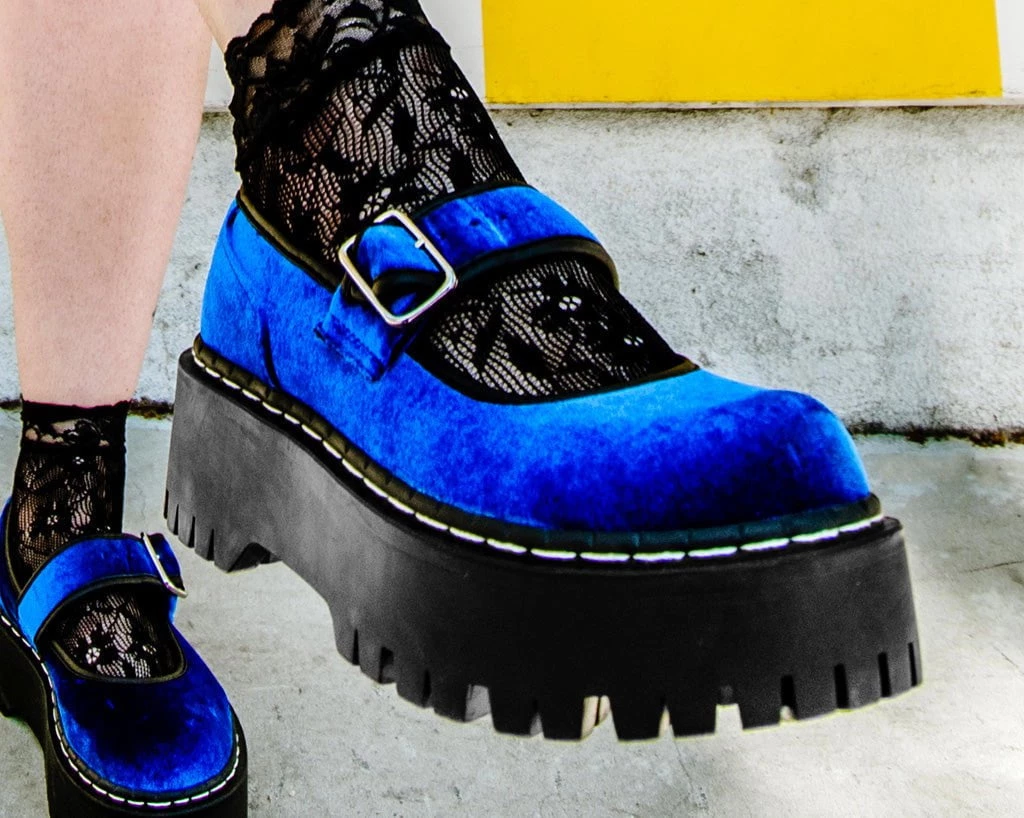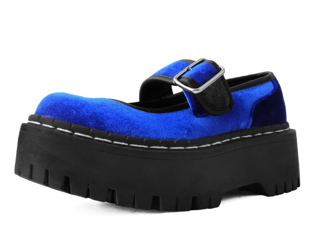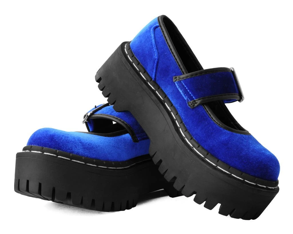 These platform Mary Janes add the perfect edge to any outfit. Has an eye-catching blue velvet upper. Features a platform height that stands at 2” with screws in the sole for extra allure. Comes with removable memory foam insoles for added comfort.