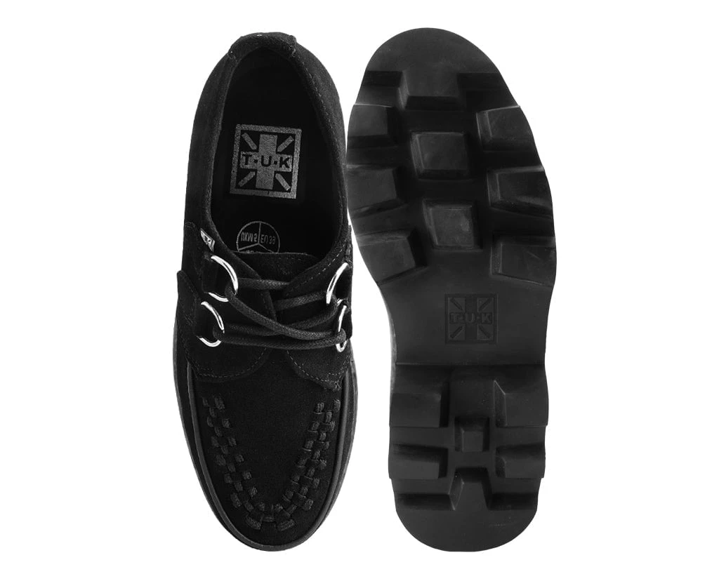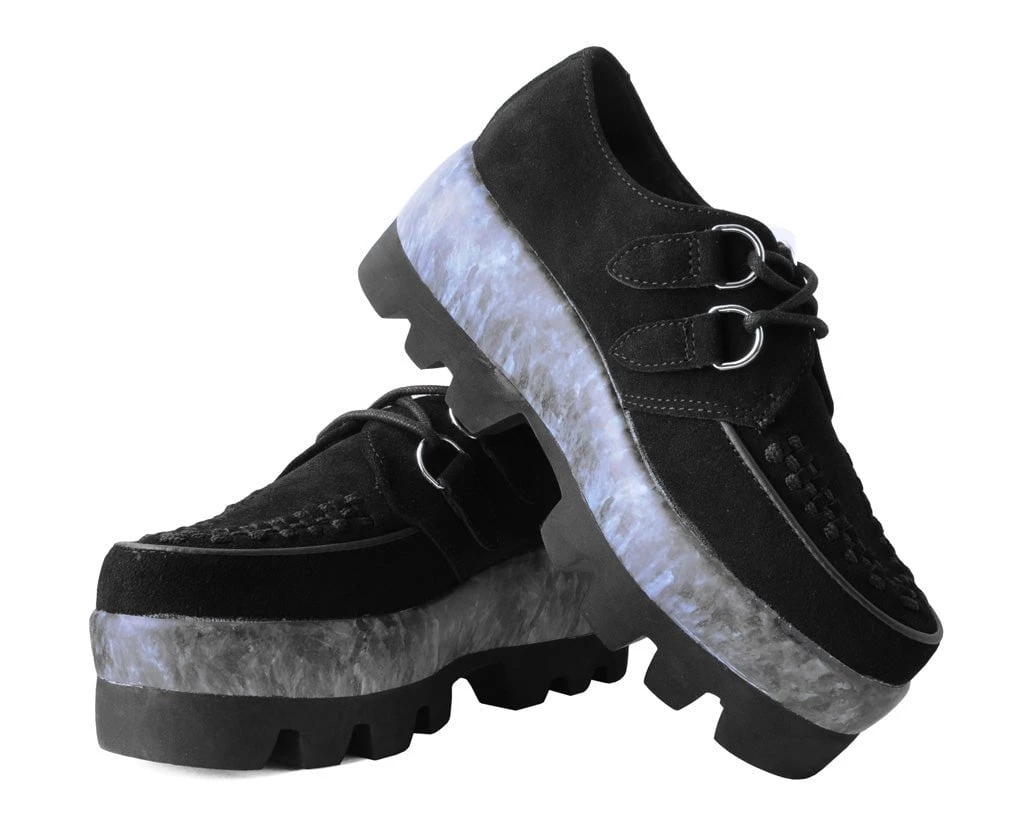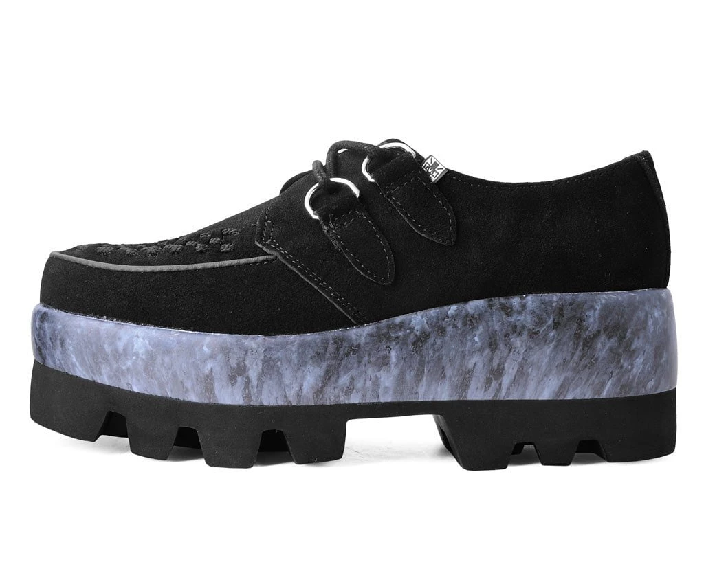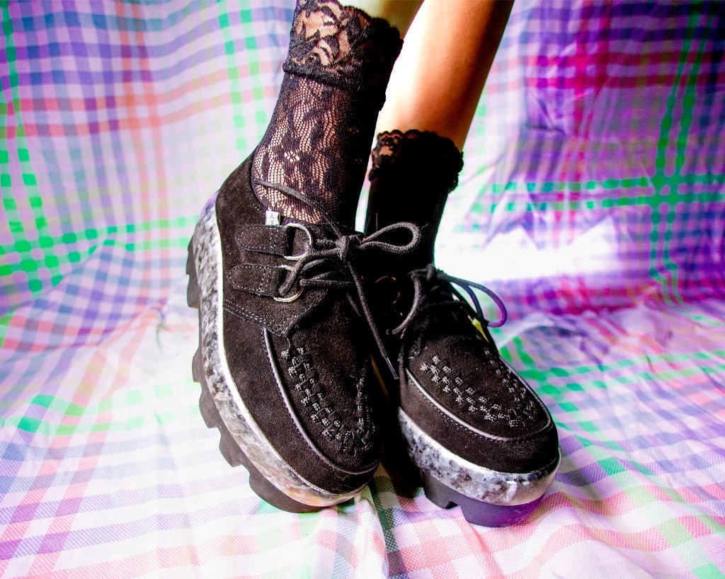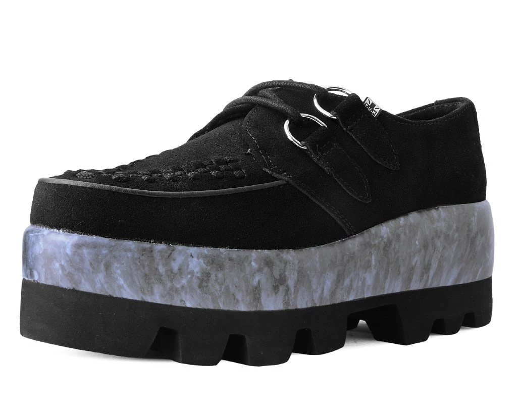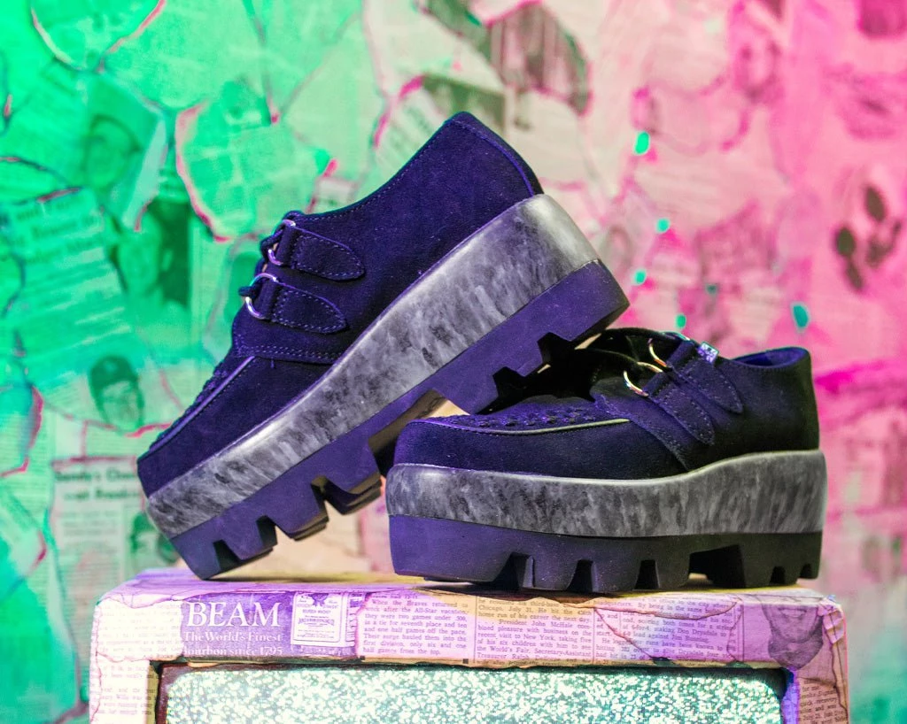 These platform creepers are above the ordinary. Amp up your shoe game with these creeper shoes featuring marble dino lug platform sole. These bad boys’ have an all-black suede upper. Has a sole height that is approximately 2 ¼” at the heel and 1 7/8” in the front. Has removable memory foam padding for added comfort.