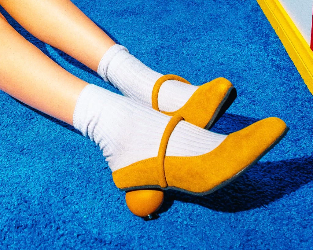 These slip-on heels feature a funky ball heel shape. Has a vegan-friendly upper made of mustard yellow faux suede. The ball heel height stands at 2” tall.