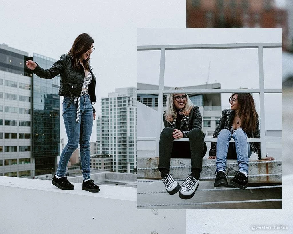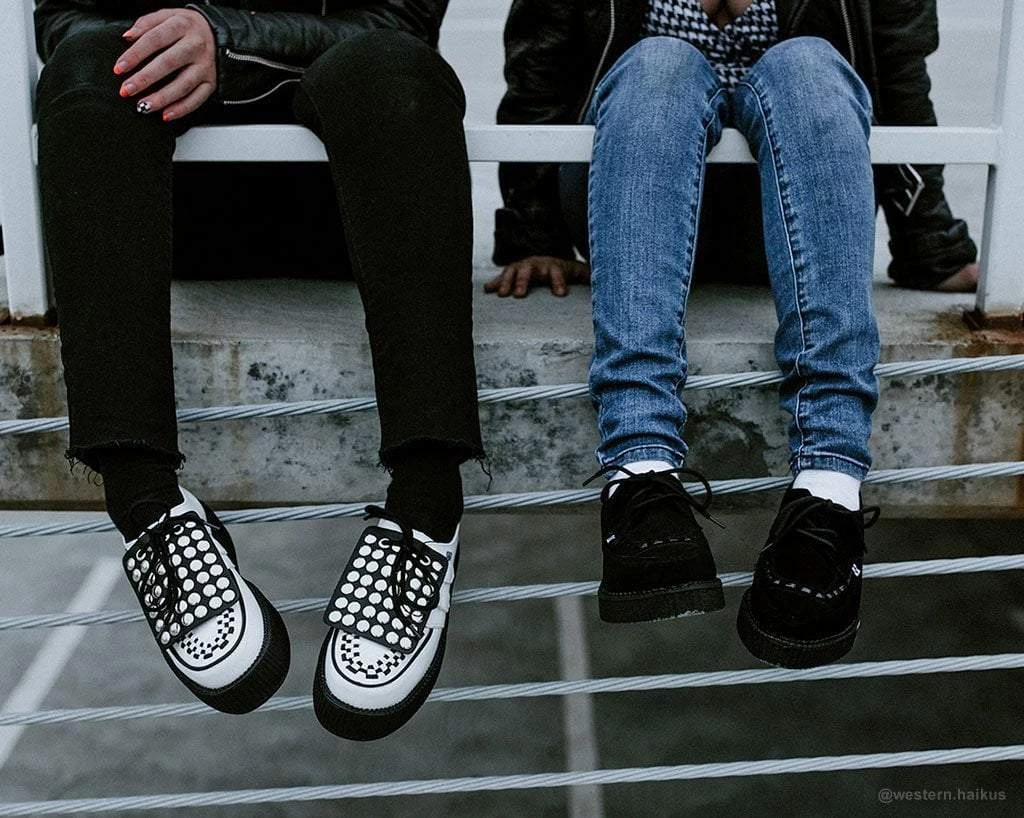 Get to the point in these T.U.K. Original pointed toe creepers! Upper is black cow suede and features black interlace on the vamp. Lace up closure. The T.U.K. Pointed Creeper sole is about 1 1/4 inches high.