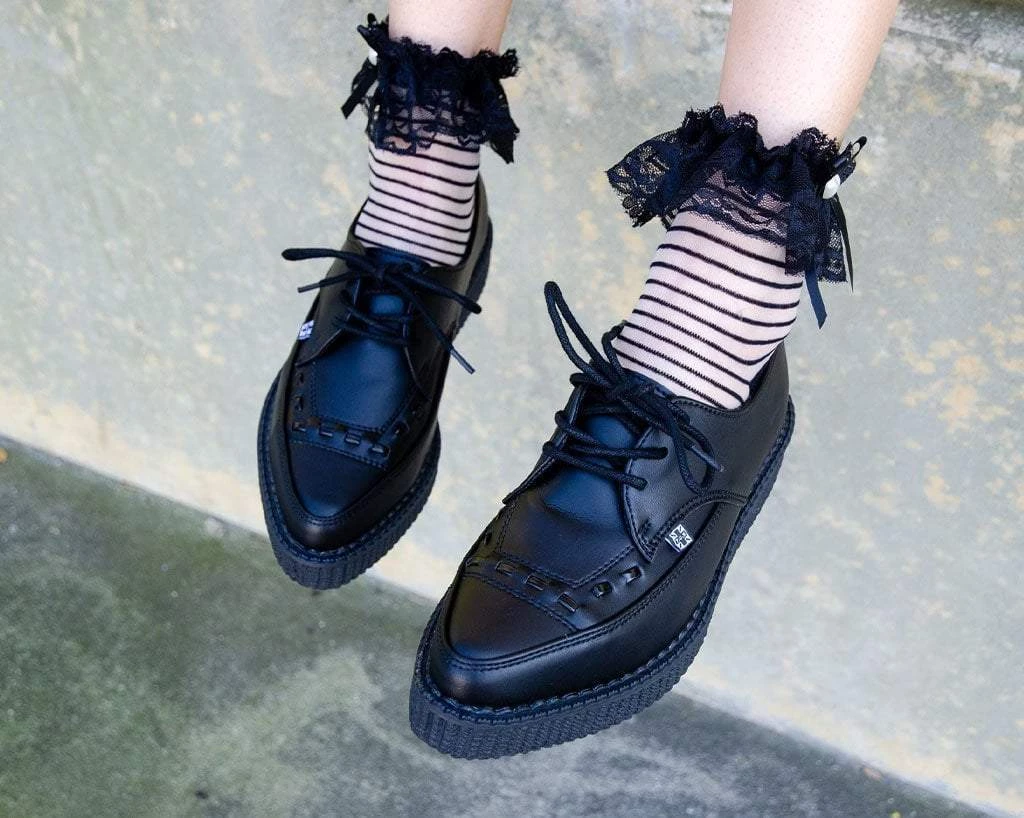Step out in style with the newest addition to the T.U.K. family — our black leather lace up pointed creepers! Perfect for dressing up these shoes feature black leather throughout, black lace detail, pointed toe. Creeper sole measures approximately 1.25 inches.