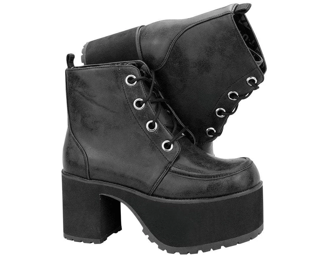 Add 3.5” of style to your step today! These durable and fashion forward platform boots provide an added lift to your style and are surprisingly easy to walk in! The distressed faux leather is vegan friendly and made with eye-catching oversized silver eyelets. These boots are true vegan shoes for the environmentally conscious shoe shopper! These shoes are a huge hit around the T.U.K. office!