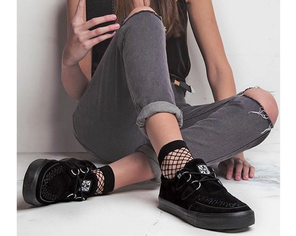 Normal is boring! Get ready to hit the stage or the streets in these vulcanized sneakers that reimagines our former creeper sneaker silhouette with bold & modern twists. Features one of our crowd-pleasing upper styles of black cow suede with classic D-rings & iconic interlace detailing along the front.