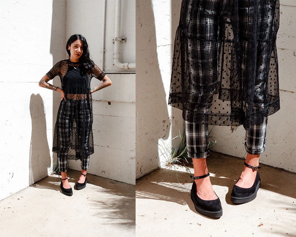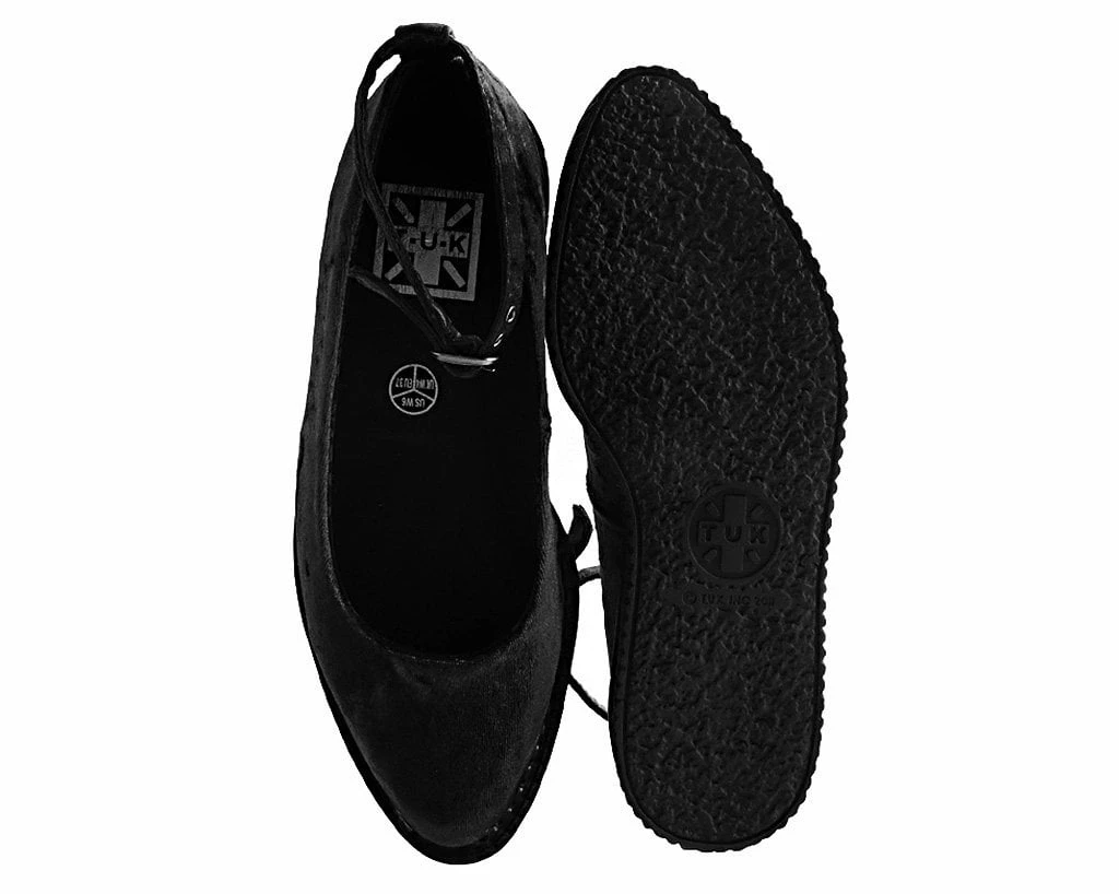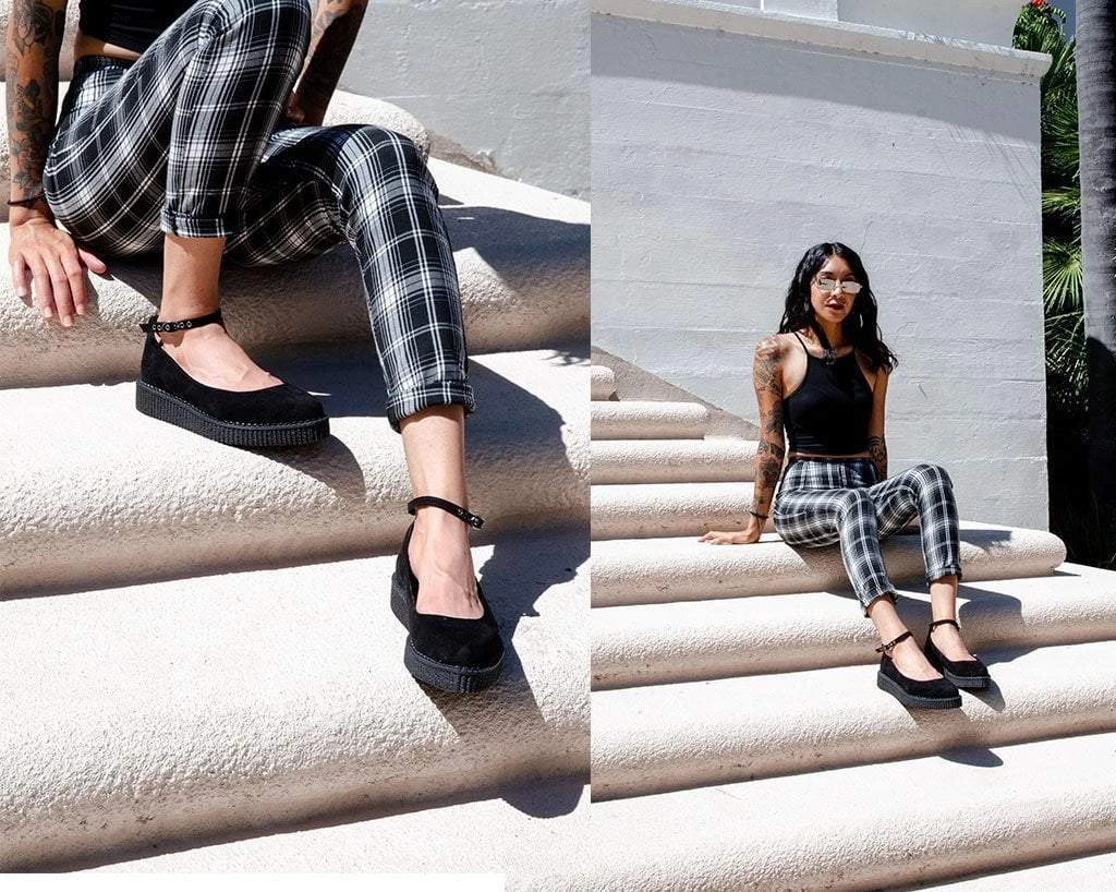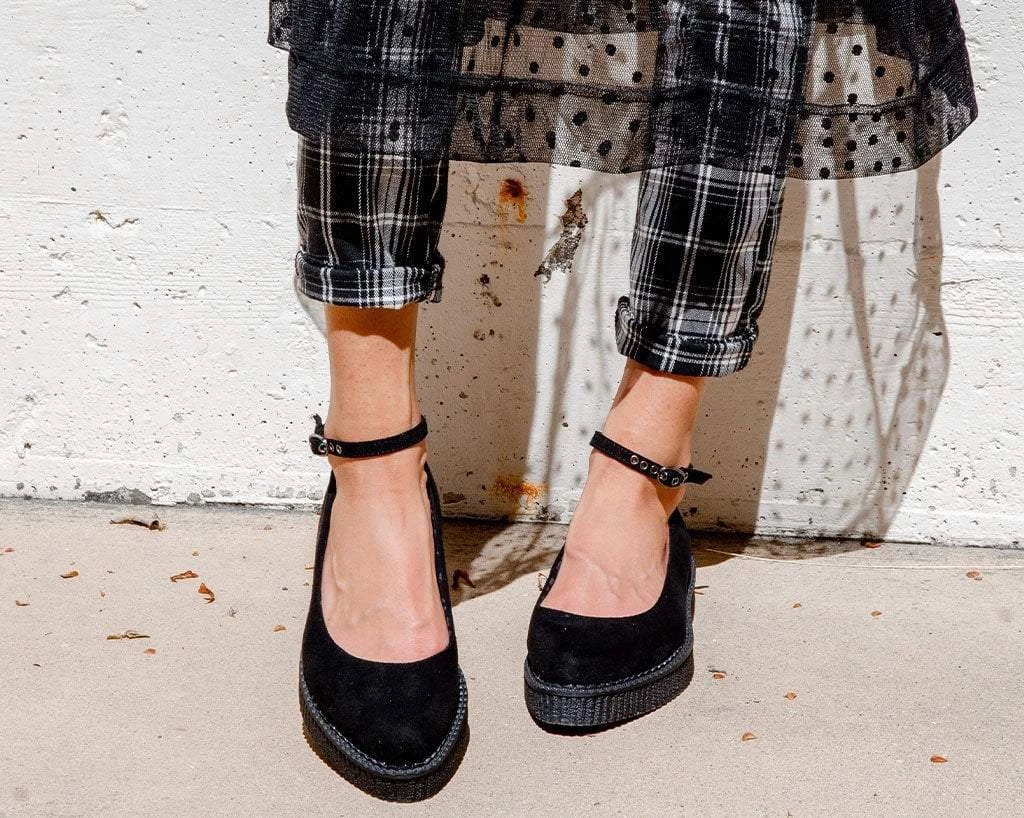 Take center stage in on pointe style with these ballet-style creepers that delivers a whole lot of edgy panache. Features a vegan friendly all-black faux sheep suede upper with pointed toe construction and ankle strap closure for an adjustable fit. Sits on top of a low sole creeper platform that measures 1 ¼” at the heel and ¾” in the front. Has removable memory foam padding for added comfort.