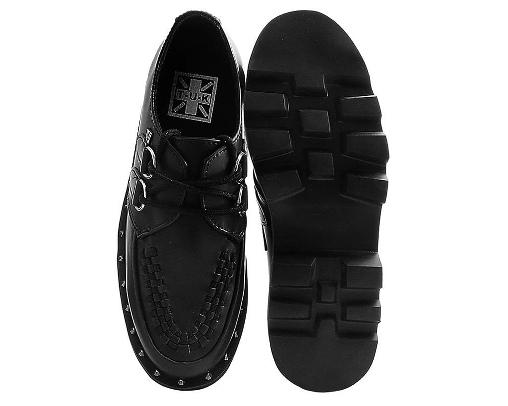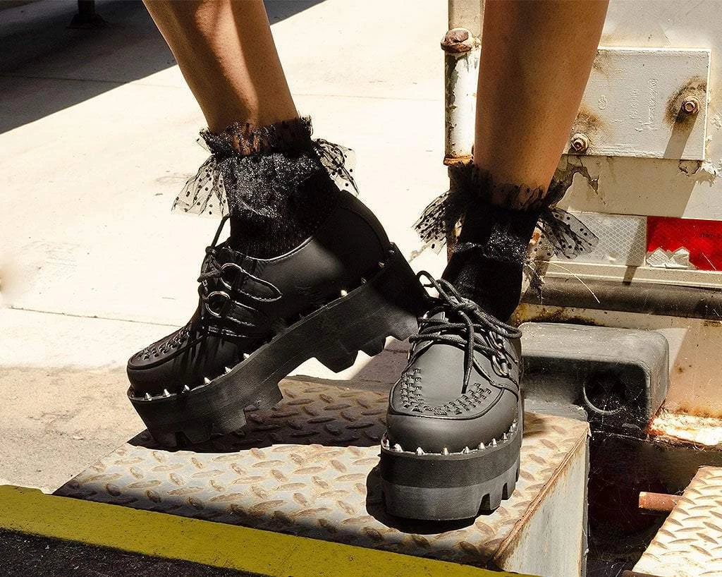 Talk about such great heights. Amp up your shoe game with these creeper shoes featuring a cool, dino lug platform sole. These bad boys’ all-black vegan friendly faux leather upper is lined with small silver spike studs for an extra finishing touch. Has a sole height that is approximately 2 ¼” at the heel and 1 7/8” in the front. Has removable memory foam padding for added comfort.