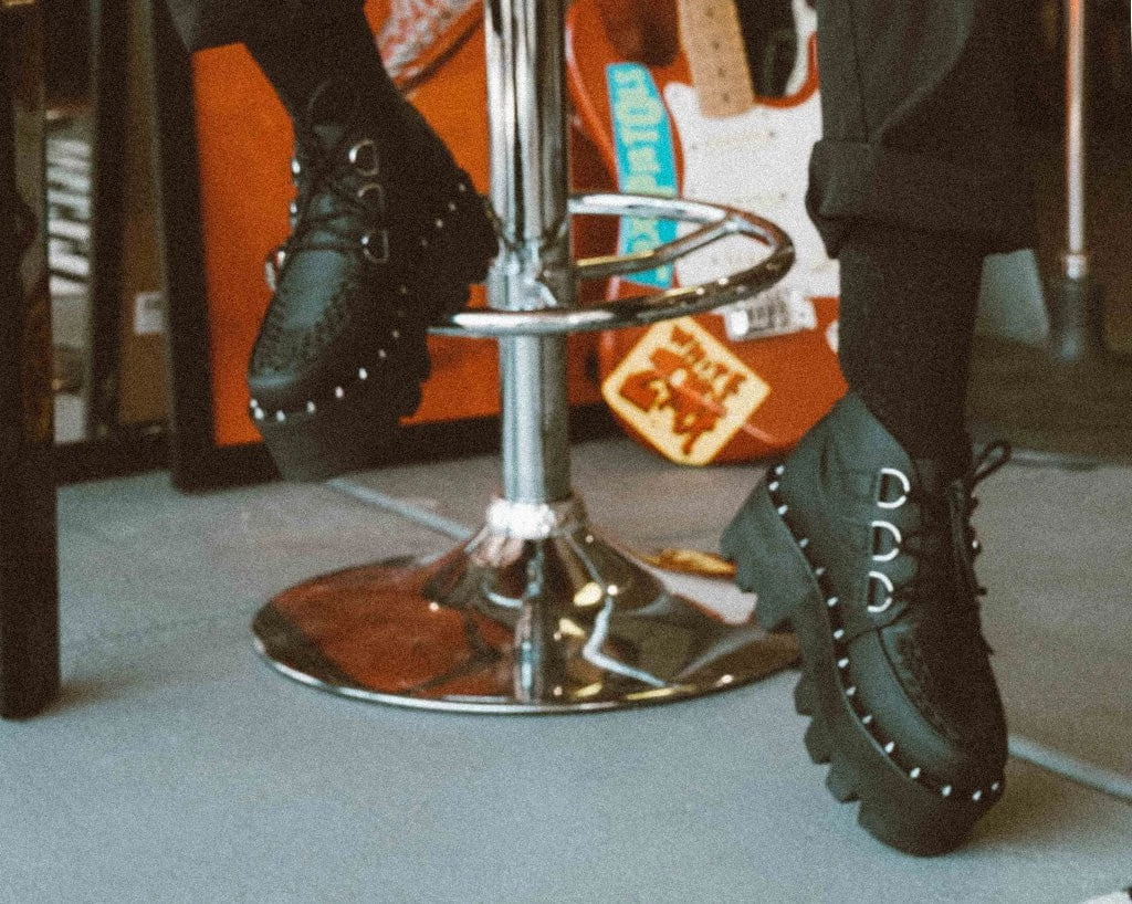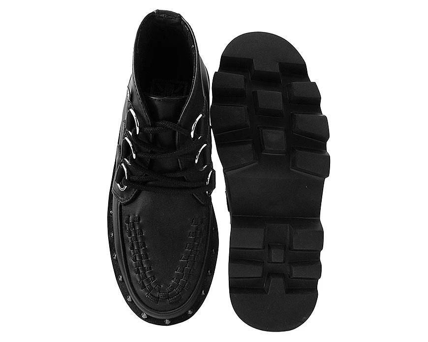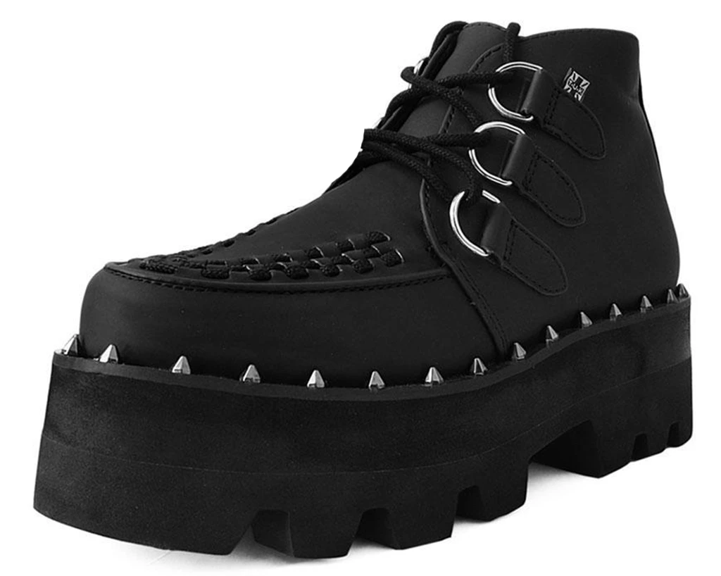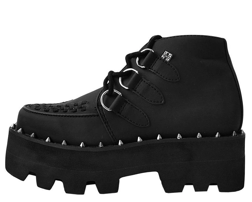 Talk about such great heights. Amp up your shoe game with these creeper boots featuring a cool, dino lug platform sole. Features a vegan friendly black matte faux leather upper and is lined with small silver spike studs for an extra finishing touch. Has a sole height that is approximately 2 ¼” at the heel and 1 7/8” in the front. Has removable memory foam padding for added comfort.