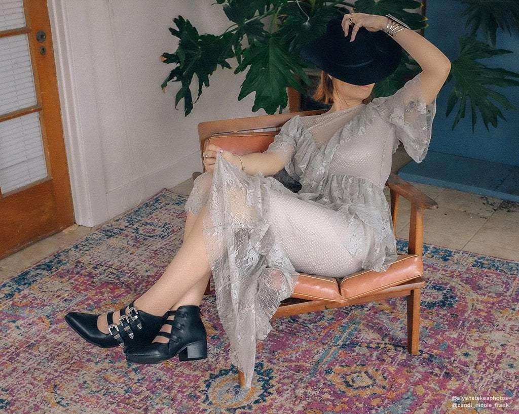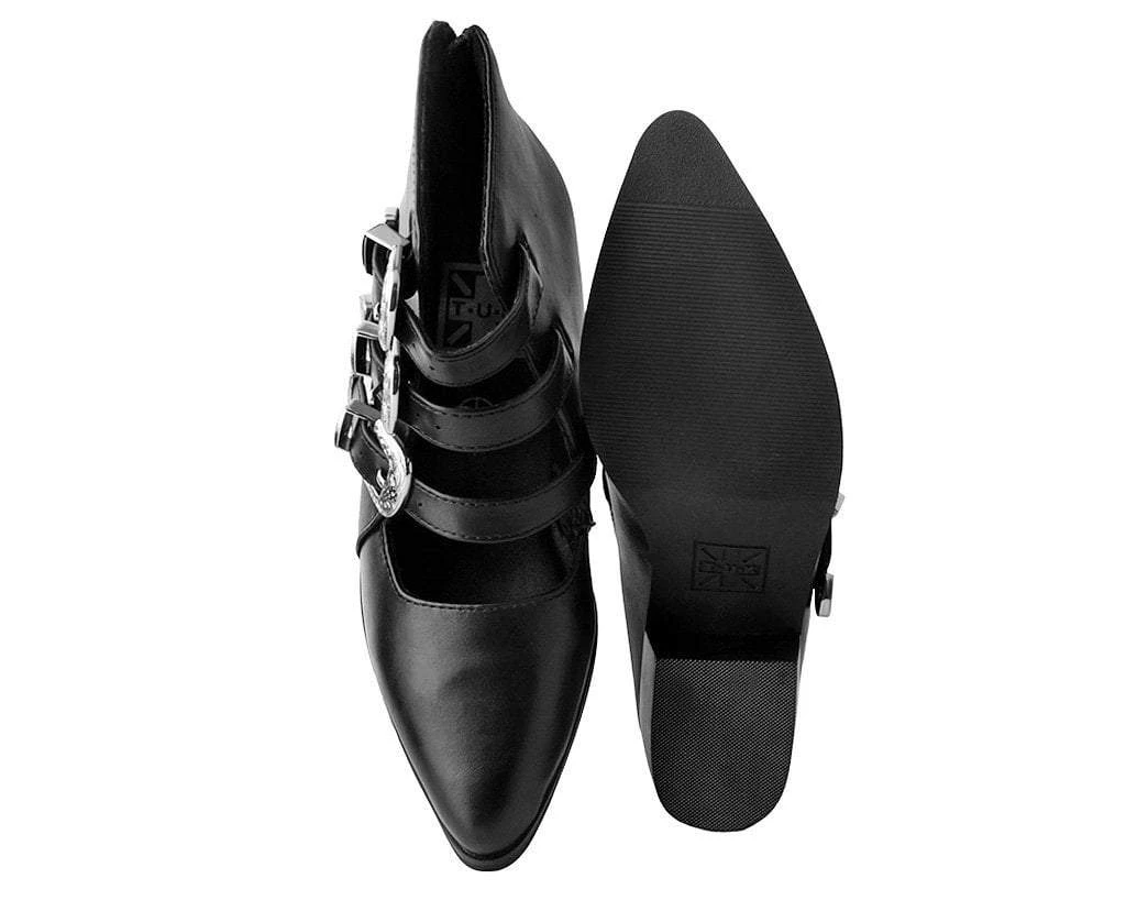 Walk the line and come out on top of any shoe showdown in these western-inspired heels. Features a vegan friendly black faux leather upper with a pointed toe construction and complemented by triple western buckle strap accents. Has a block heel height of 2 ¼” and back zipper for easy on/off wear.