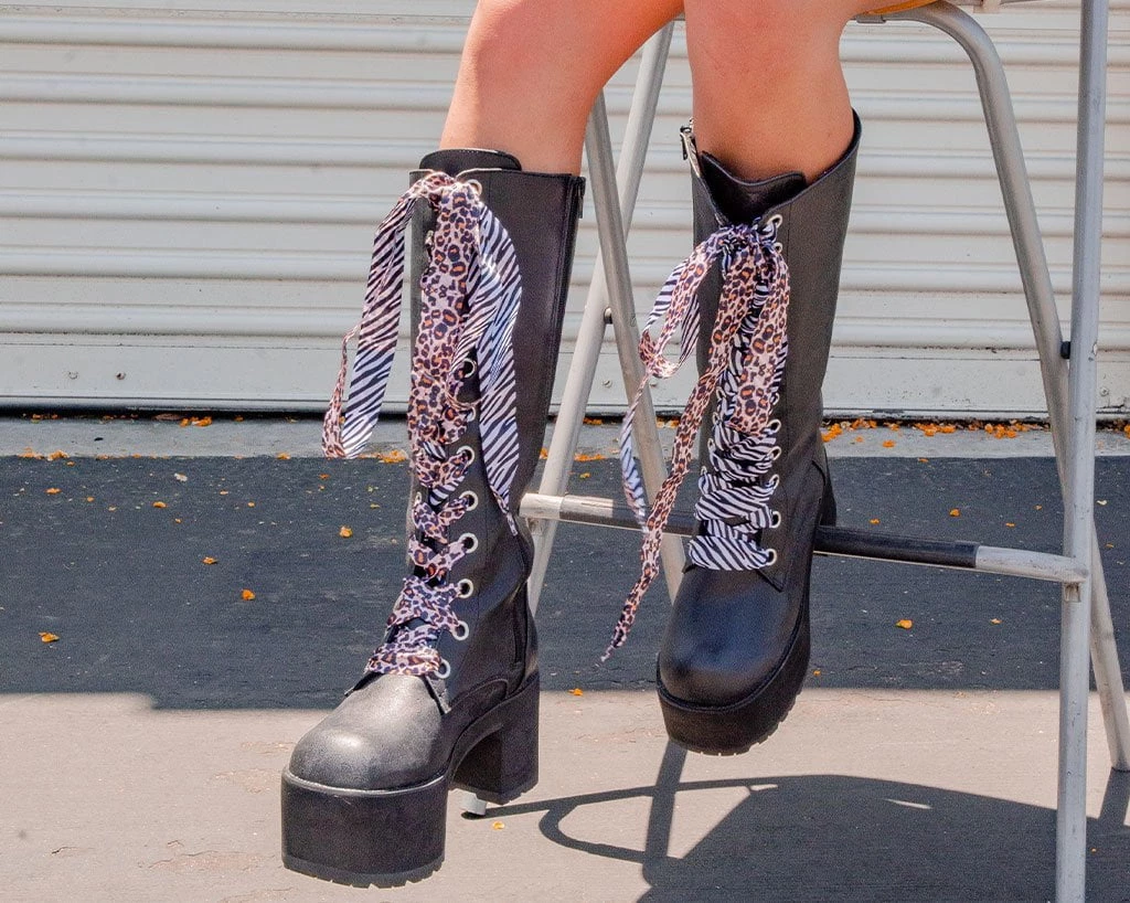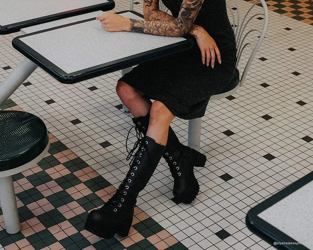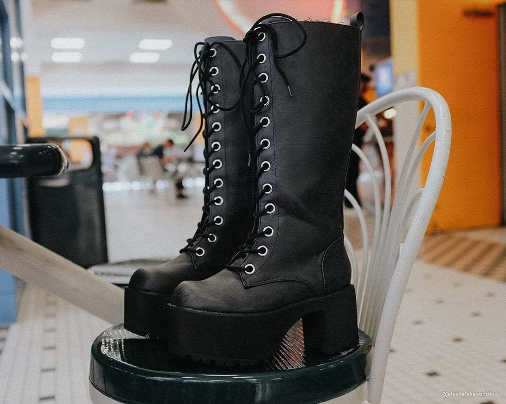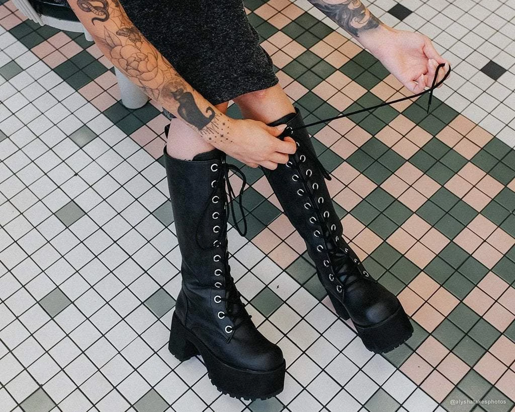 Hello elevated shoe game! Live out your 80’s rocker badass dreams with these statement knee-high boots. Stand tall and proud in these vegan friendly platform boots featuring a cool distressed black faux leather upper and a 3.5” chunky block heel height for a sturdy, elevated lift. Has an inside zipper closure for easy on/off.