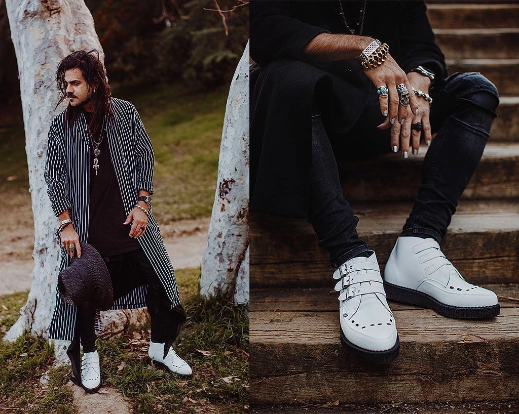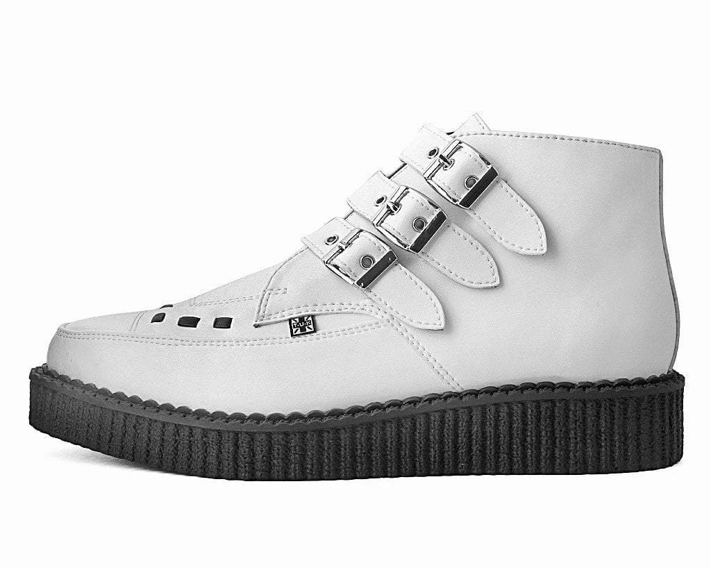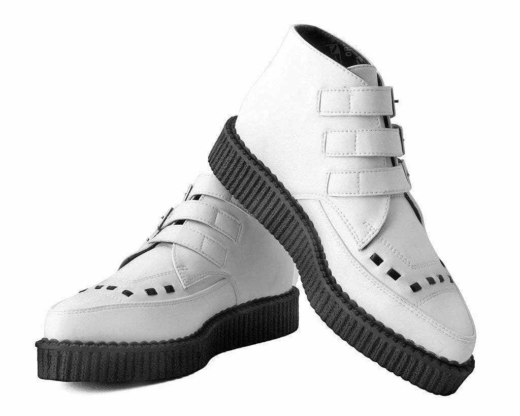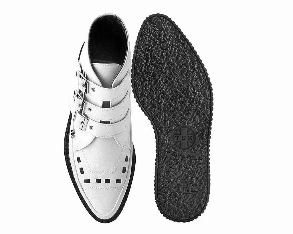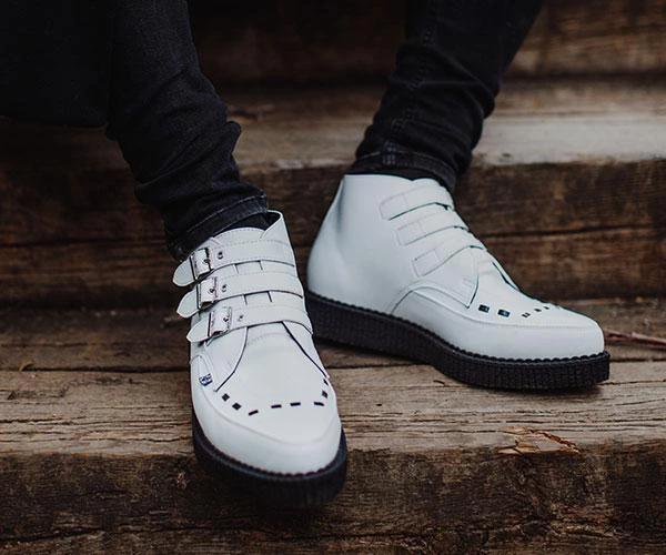 A new spin on a classic style. Keep your style sharp with these rocker ankle creeper boots. Features an all-white upper made of our high quality TUKskin(tm) material- polishable synthetic faux leather that is both soft and breathable. Has a three-strap metal buckle closure with a low sole platform that measures approximately 1 1/4” at the heel and 3/4” in the front. Includes removable memory foam insoles for added comfort. Shoe can be easily cleaned with mild soap and water.