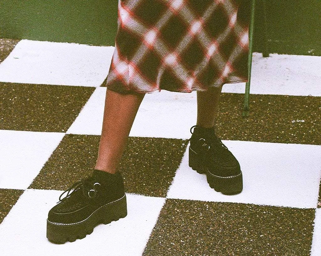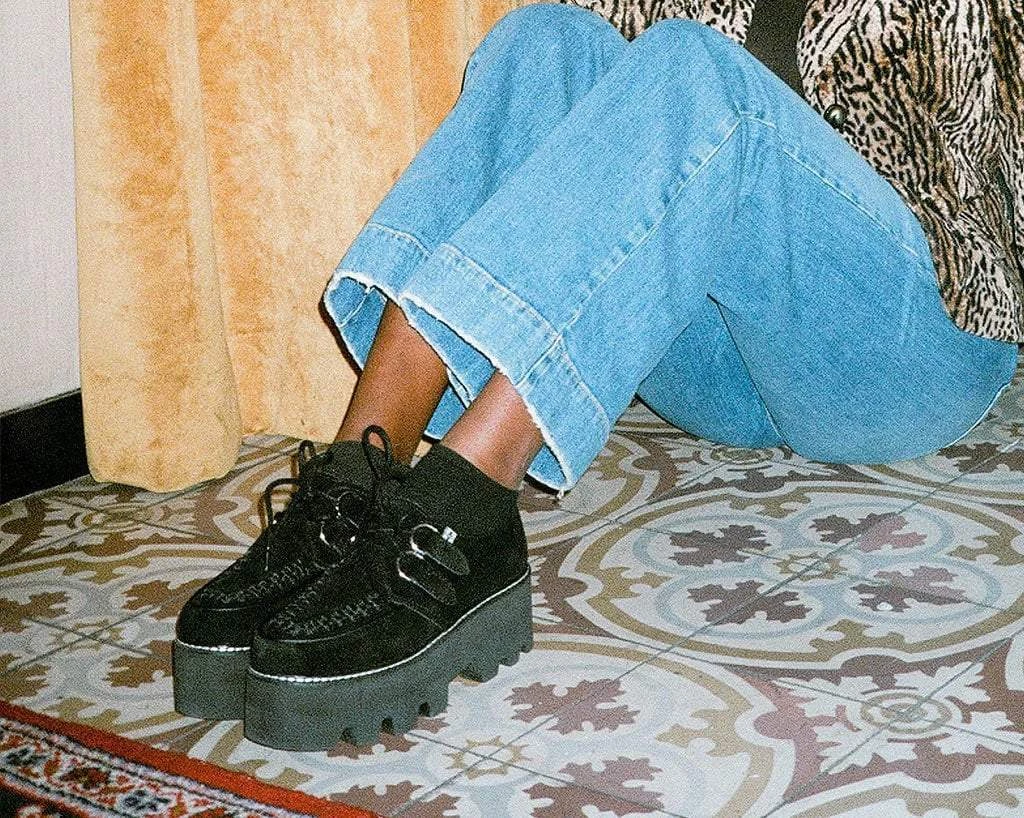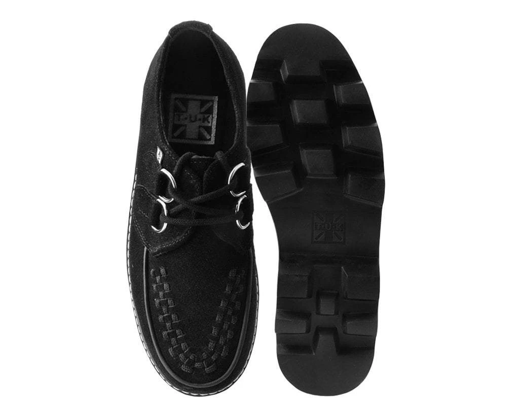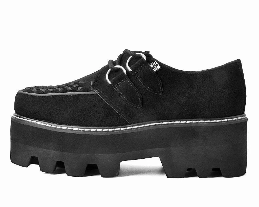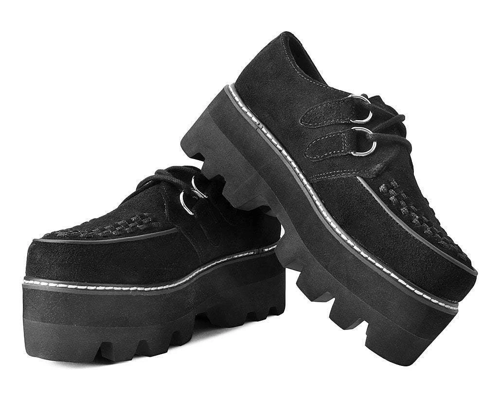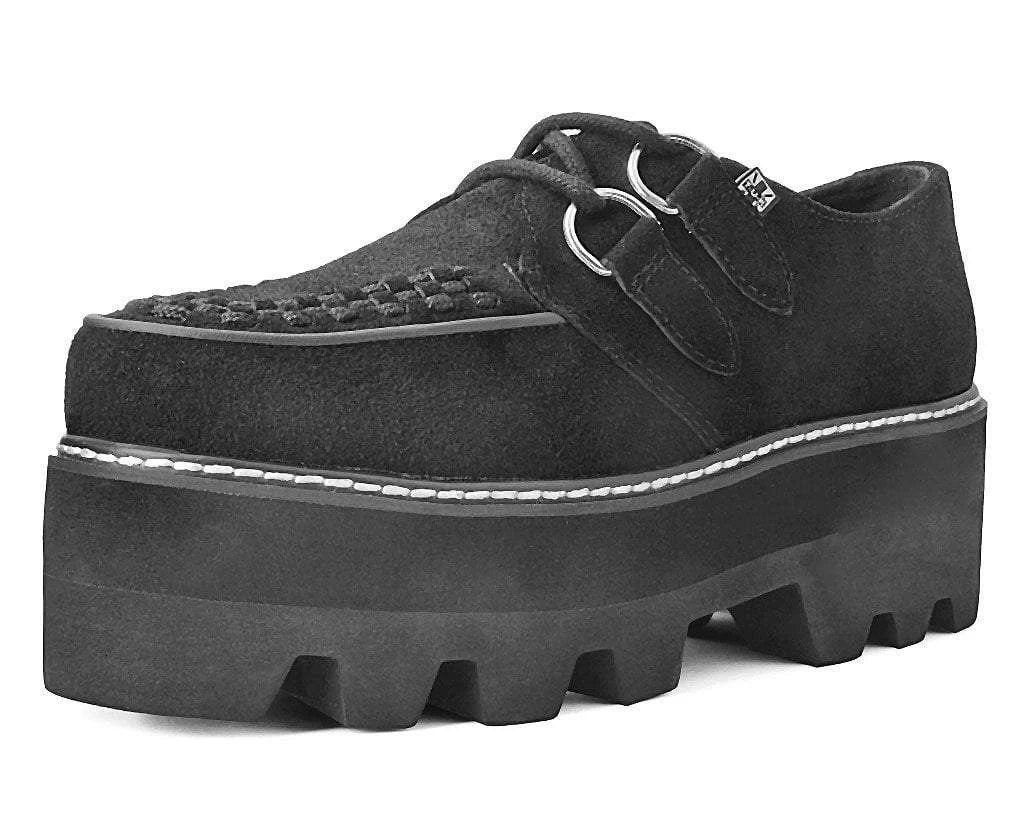 These platform creepers are above the ordinary. Amp up your shoe game with these creeper shoes featuring a cool, dino lug platform sole. These bad boys’ have an all-black suede upper. Has a sole height that is approximately 2 ¼” at the heel and 1 7/8” in the front. Has removable memory foam padding for added comfort.