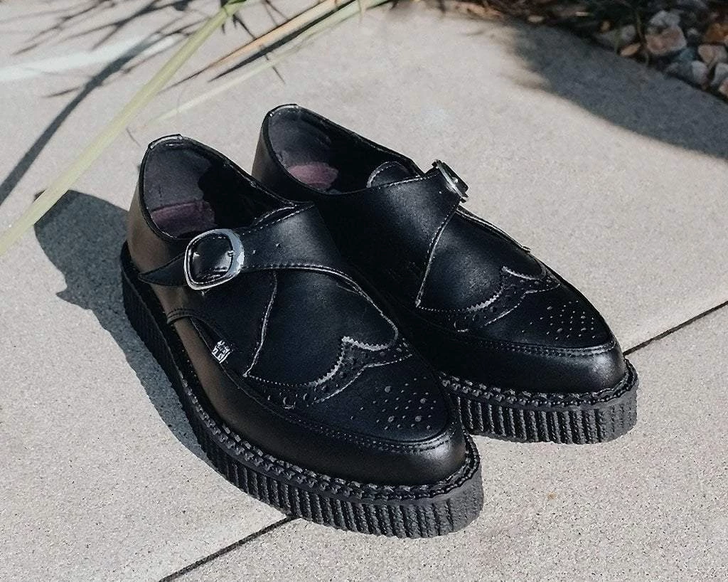 The wardrobe staple of the season. Stay sleek in brogue wingtip creepers. Has a black upper made of our high quality TUKskin material- polishable synthetic faux leather that is both soft and breathable. Features buckle closure and on top of a low sole creeper platform that measures 1 1/4” at the heel and 3/4” in the front and has removable memory foam insoles for added comfort.