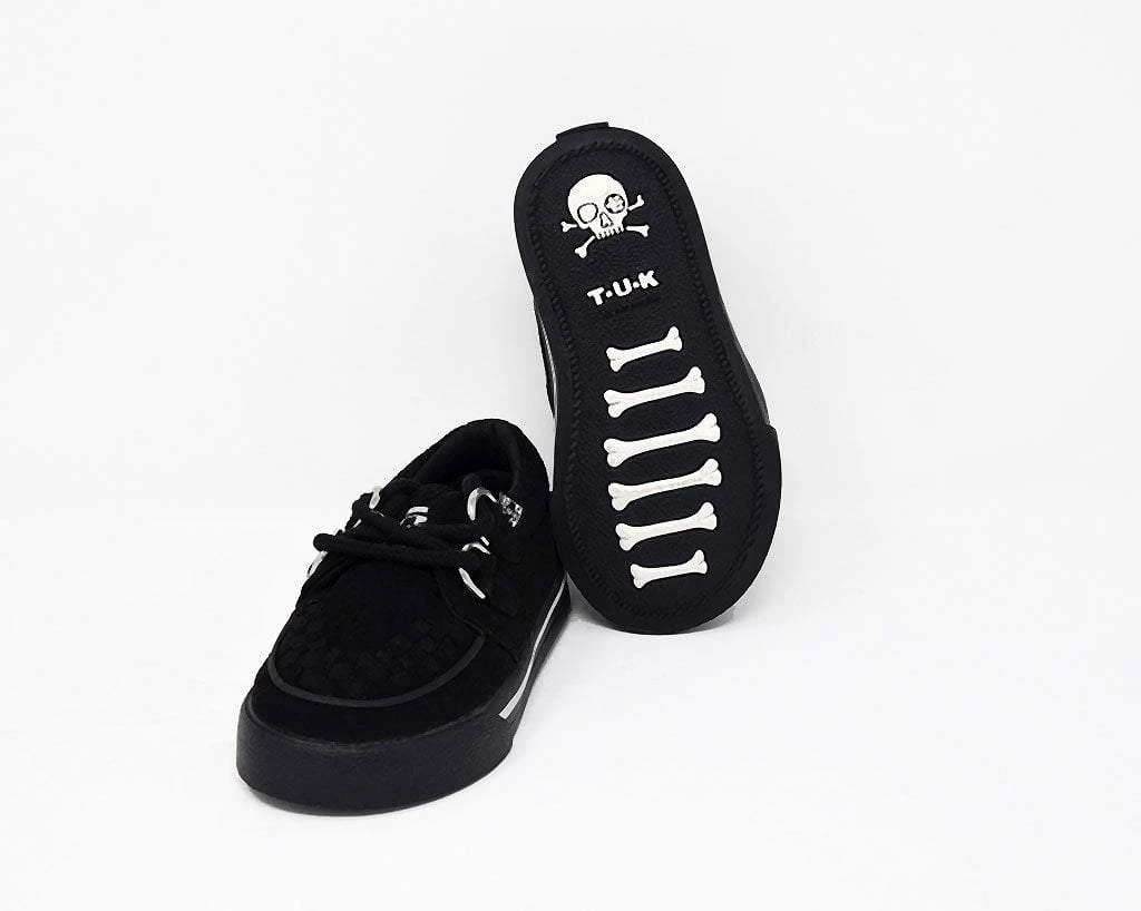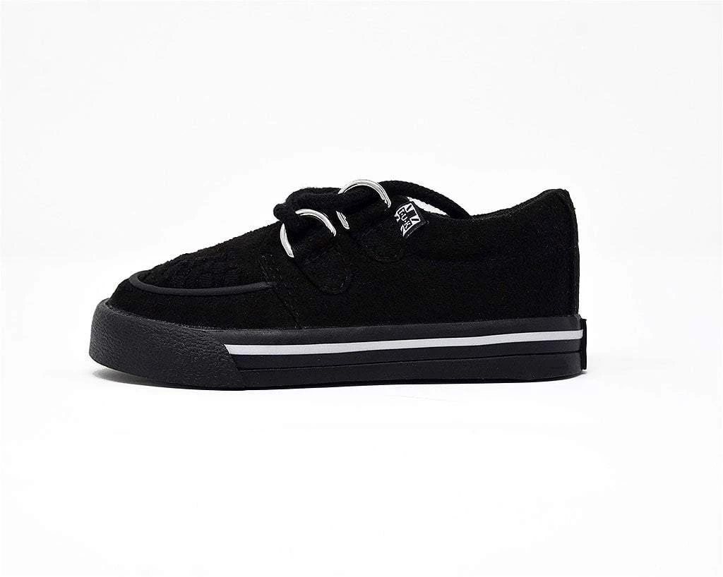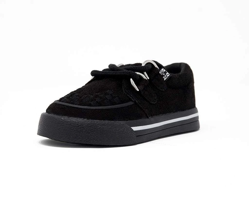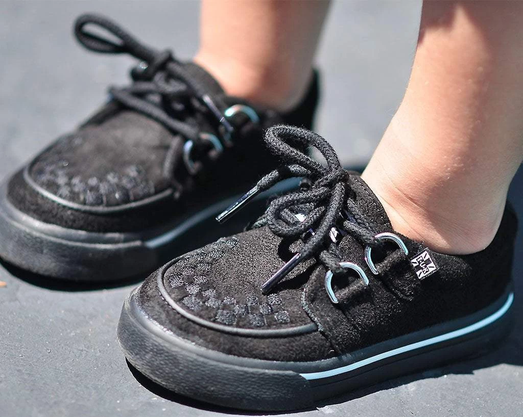 Hey wild child. Lace into these toddler creeper sneakers that has a vegan friendly all-black microfiber upper. Features our vulcanized VLK creeper sneaker silhouette that lends everyday wearability. Has D-ring lace up closure and a lightly padded tongue along with removable memory foam insoles for added comfort.
