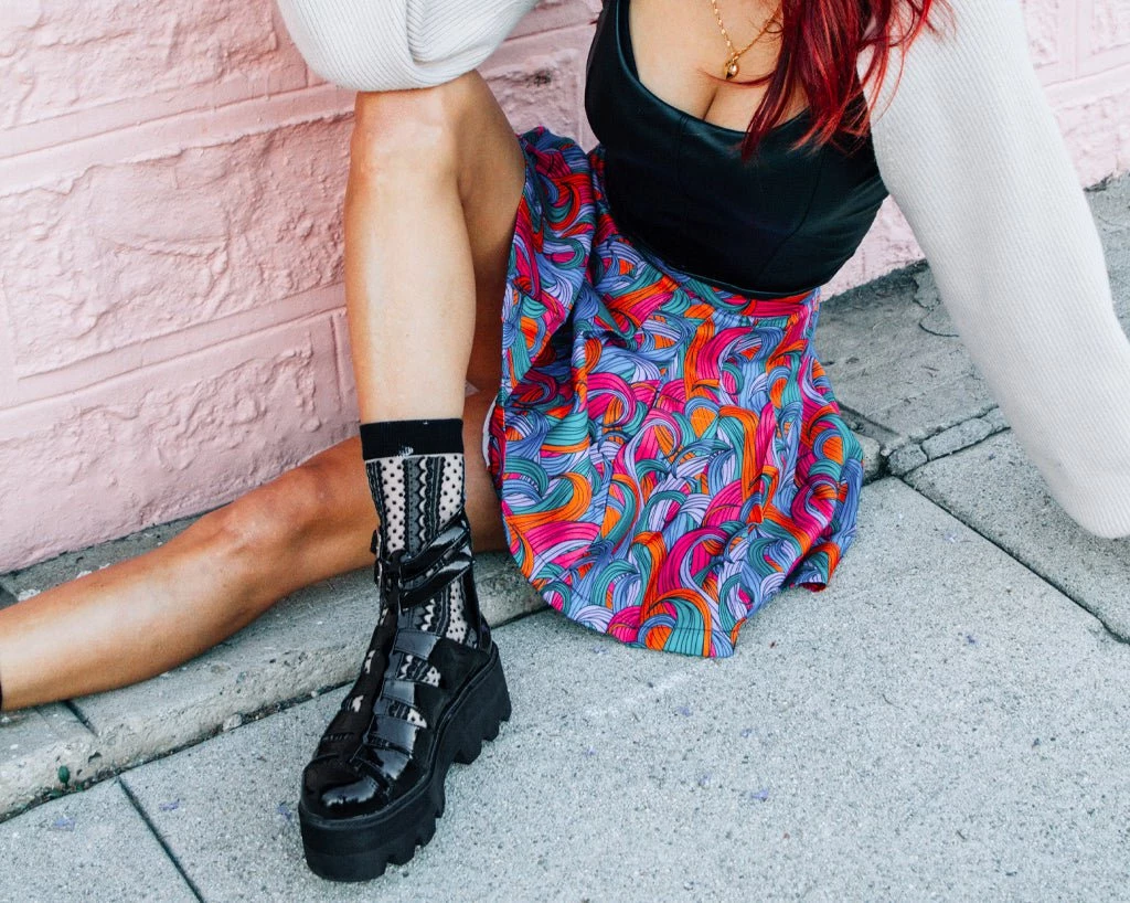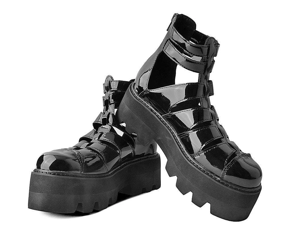 Sorry, the gothic aesthetic stays on during beach day. Show off your style in these gladiator style creeper platform sandals that’ll make even Xena jealous. Features an all-black upper with a back zipper for easy on/off wear and sits on top of a sole height that is approximately 2 ¼” at the heel and 1 7/8” in the front. Has removable memory foam padding for added comfort.