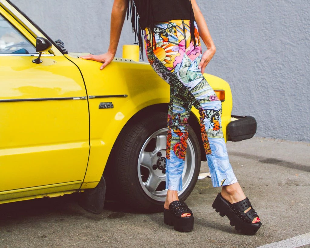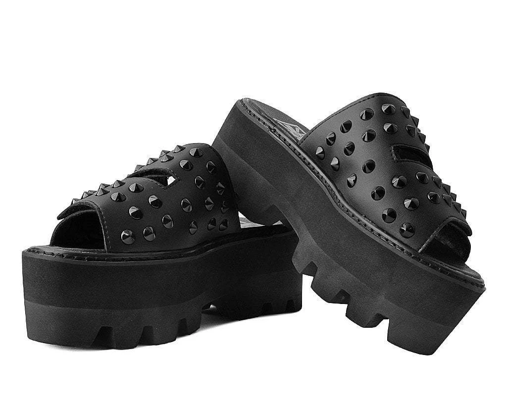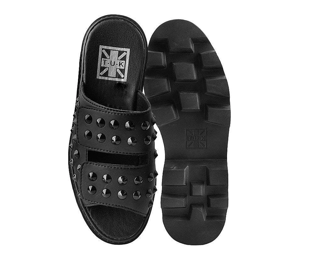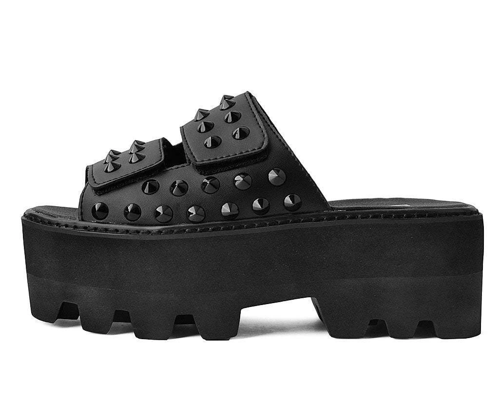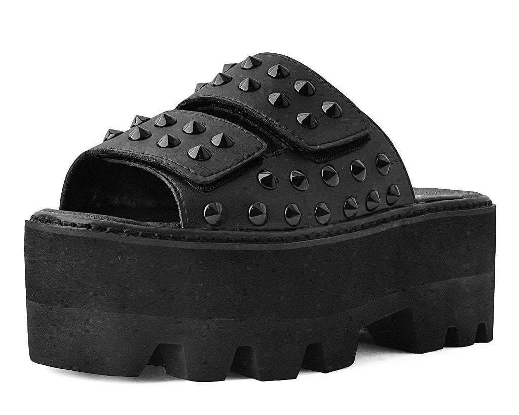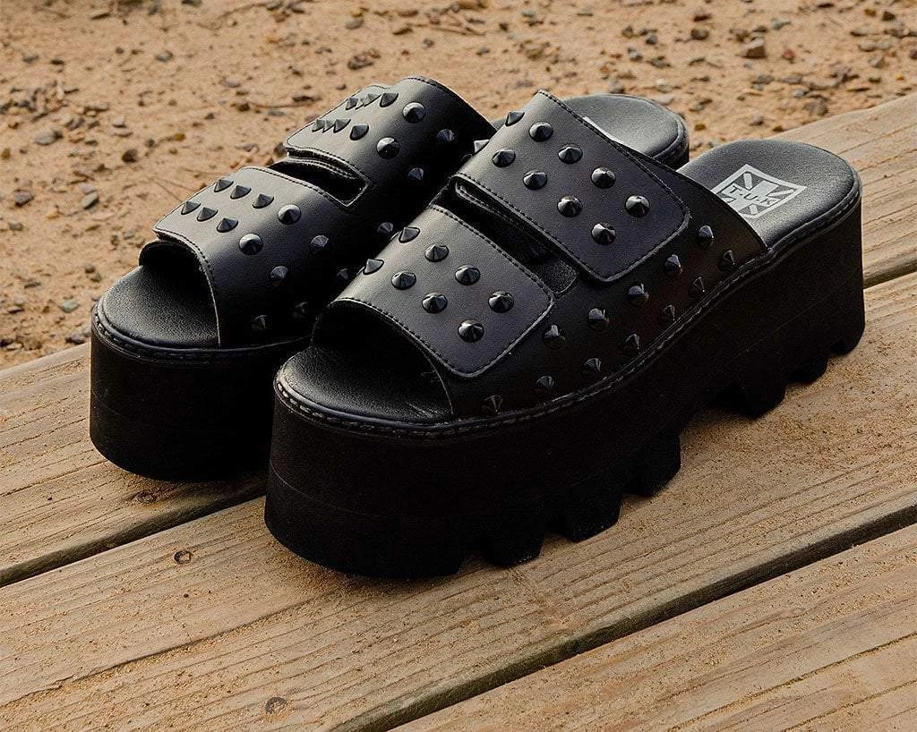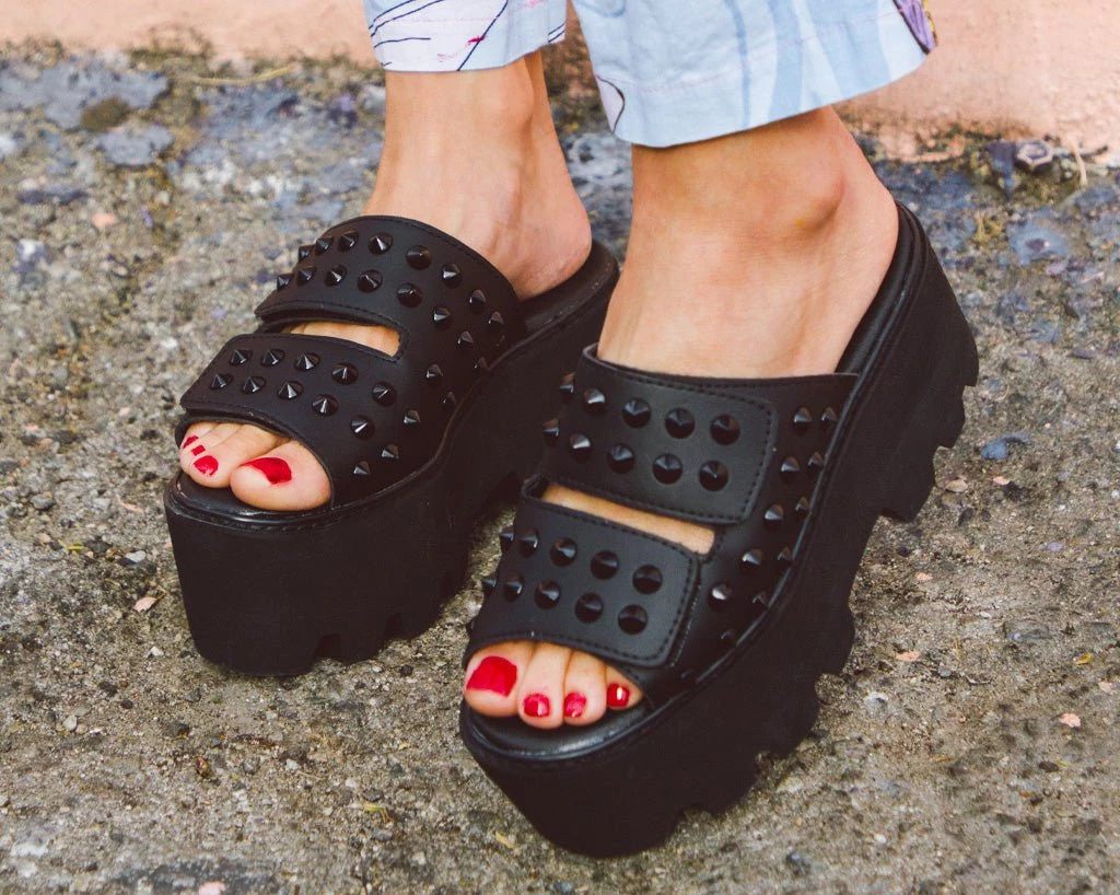 Amp up your shoe game with these sandals featuring a cool, dino lug platform sole. These bad boys’ all-black vegan friendly faux leather upper is lined with small black spike studs for an extra finishing touch. Has a sole height that is approximately 2 ¼” at the heel and 1 7/8” in the front. Has removable memory foam padding for added comfort.