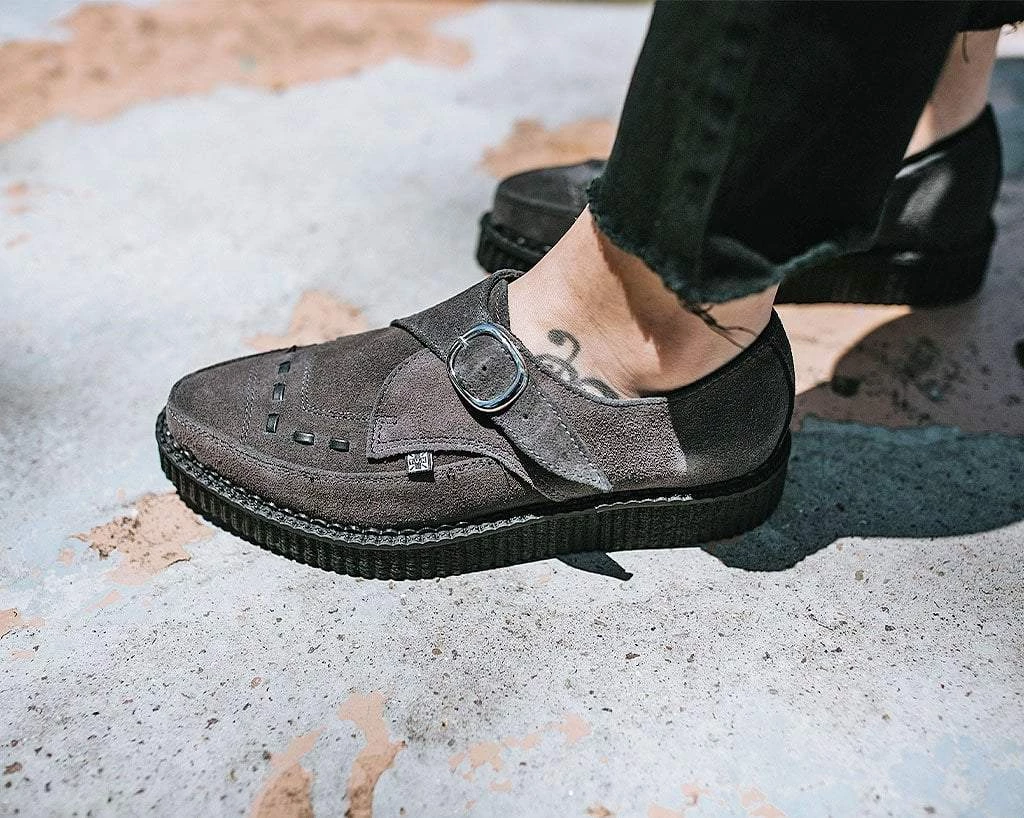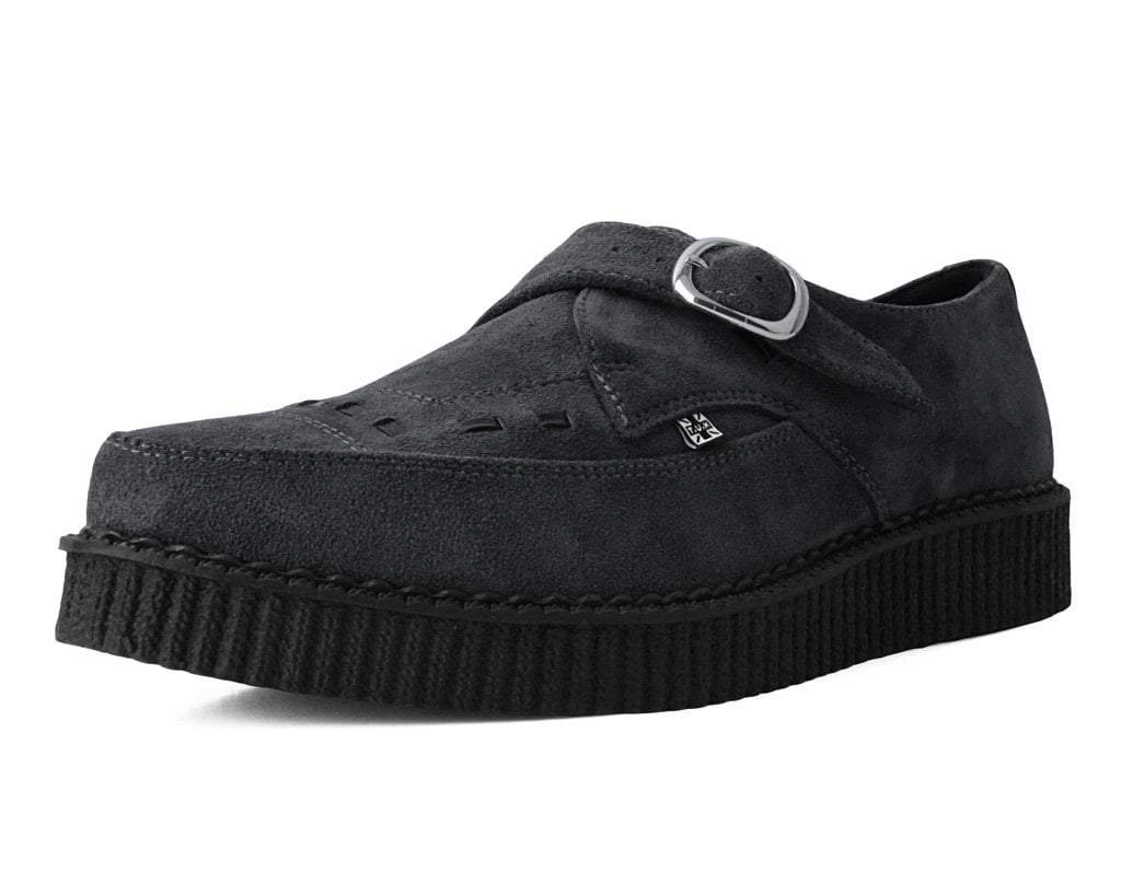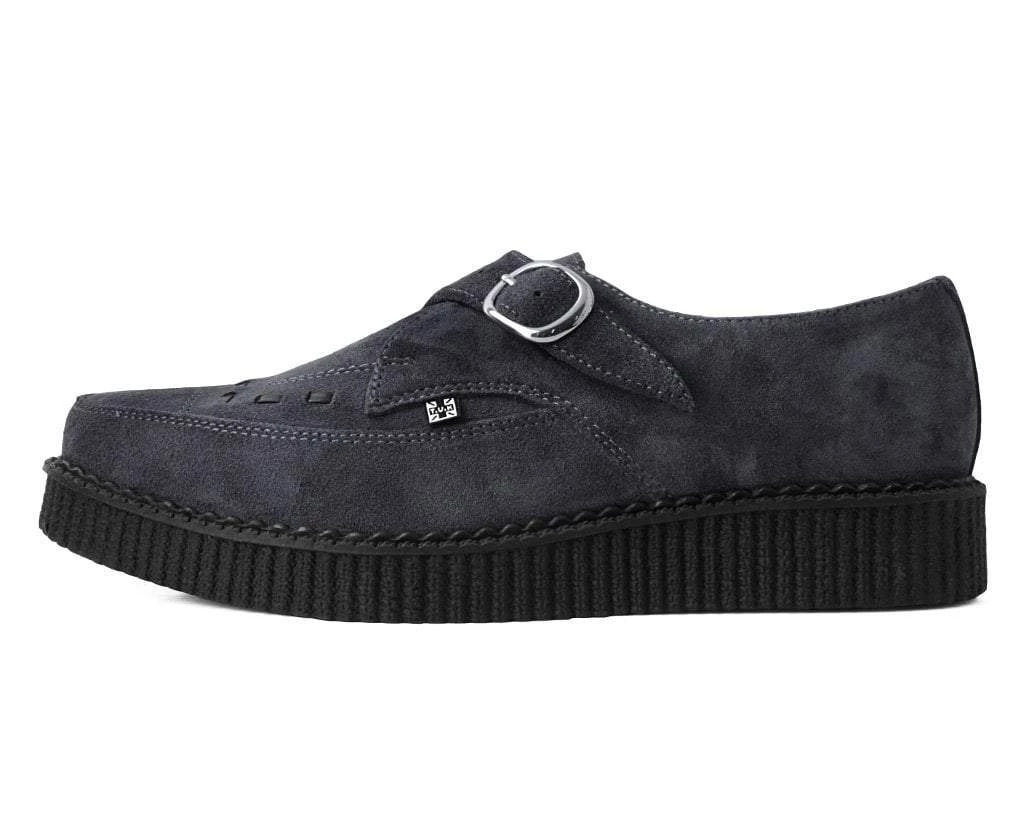 Classic kicks with a twist. These grey pointed toe creepers sit on top of a low sole that measures 1 ¼” at the heel and ¾” in the front and has a monk buckle strap closure. Includes removable memory foam insoles for added comfort.Â
