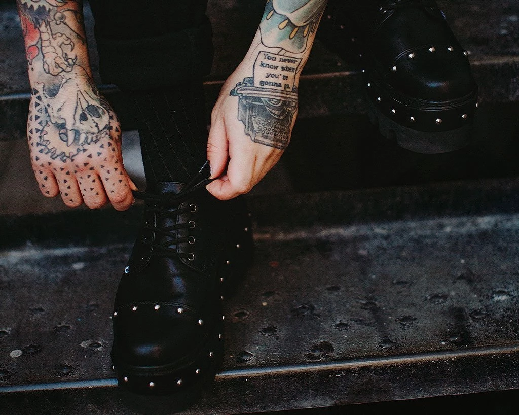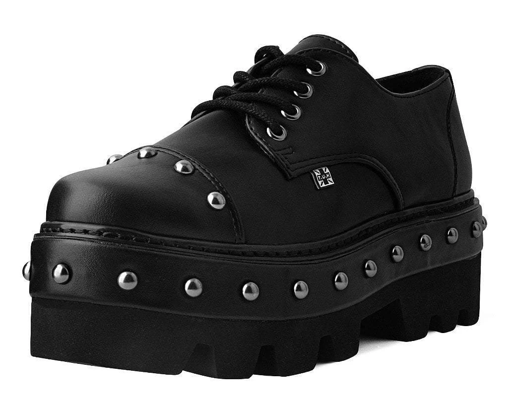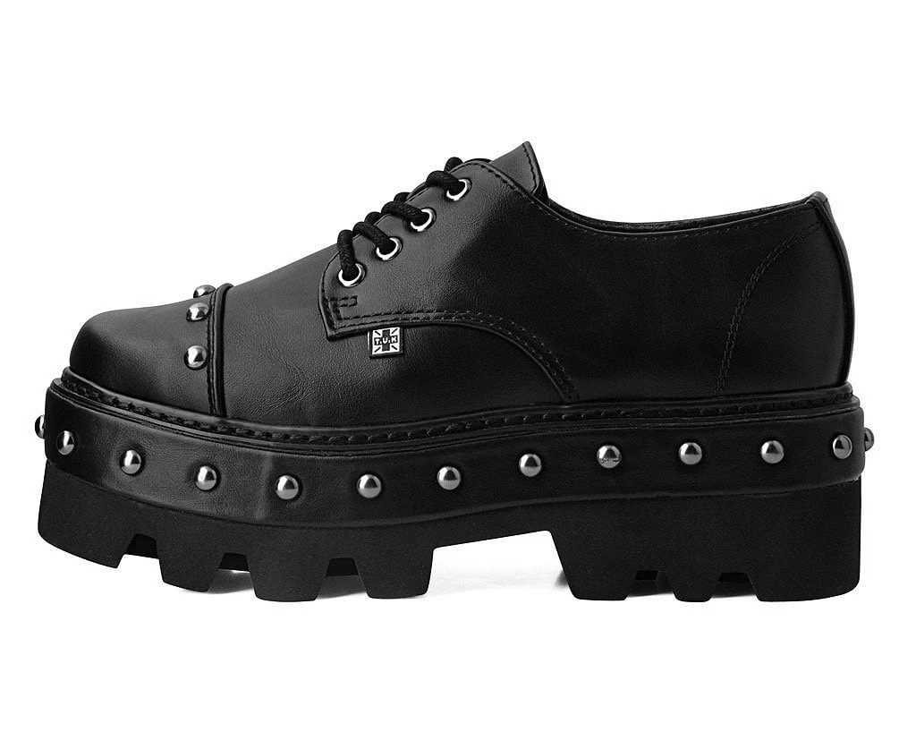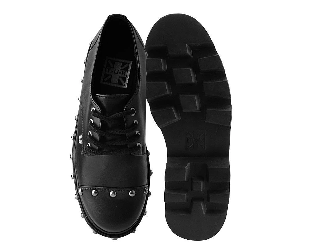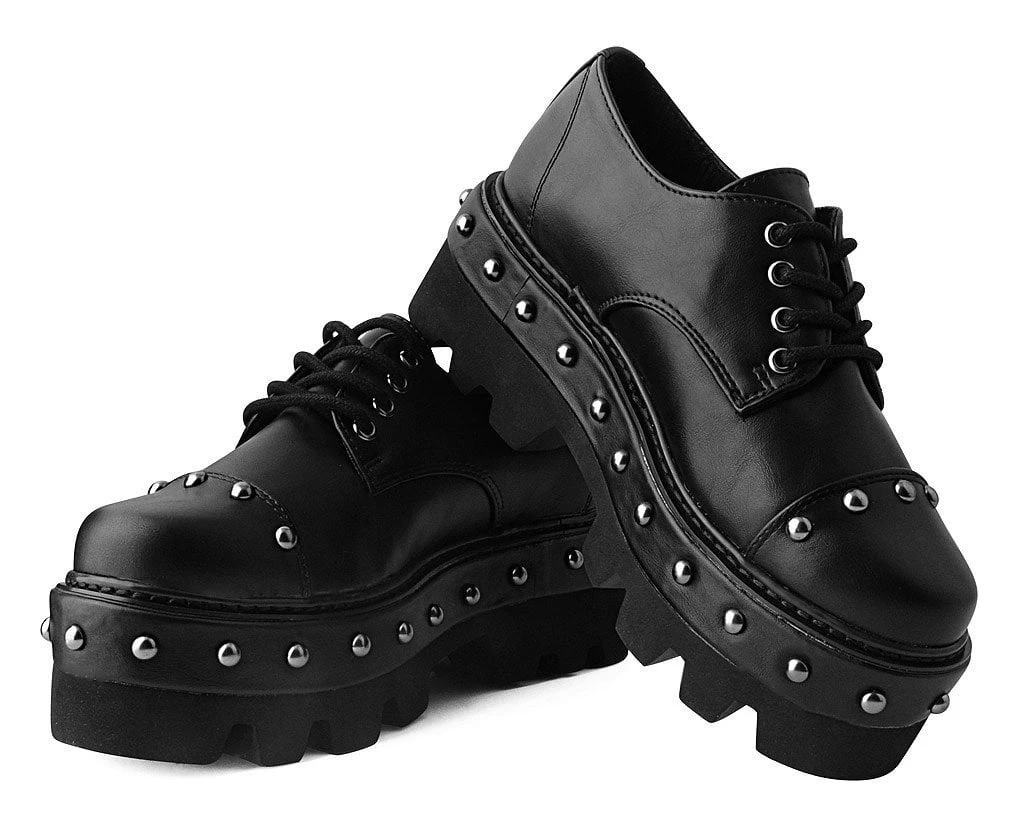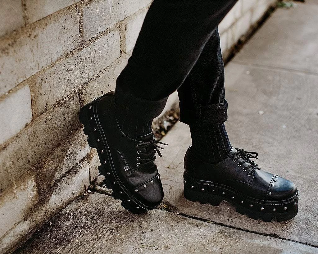 Shoes with some serious attitude. Amp up your shoe game with these Gibson style shoes featuring a cool, dino lug platform sole. Features an all-black faux leather upper and is lined with small silver studs around the sole and across the vamp for an extra finishing touch. Has a platform sole height that is approximately 2 ¼” at the heel and 1 7/8” in the front. Has removable memory foam padding for added comfort.