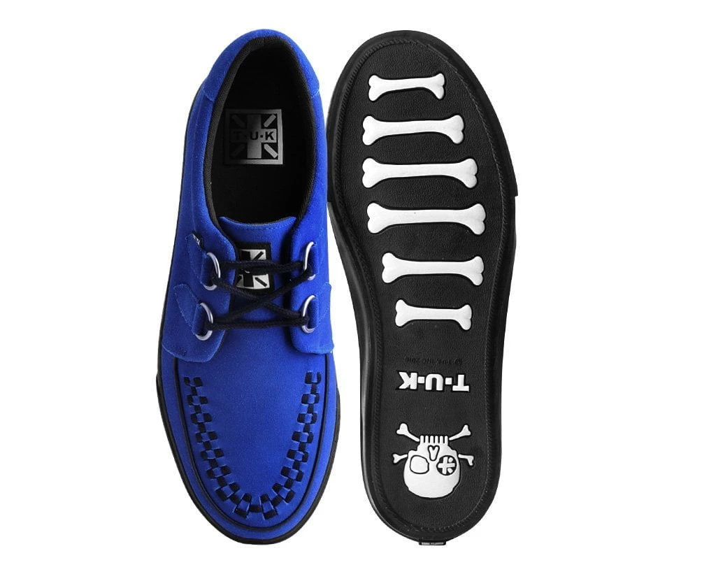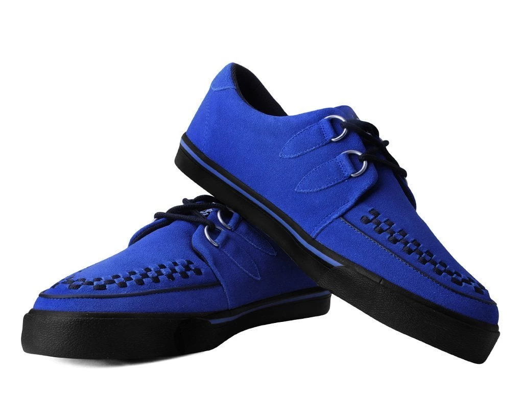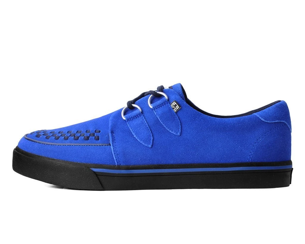Normal is boring! Get ready to hit the stage or the streets in these vulcanized sneakers that reimagines our former creeper sneaker silhouette with bold & modern twists. Features one of our crowd-pleasing upper styles of electric blue cow suede with classic D-rings & iconic interlace detailing along the front.