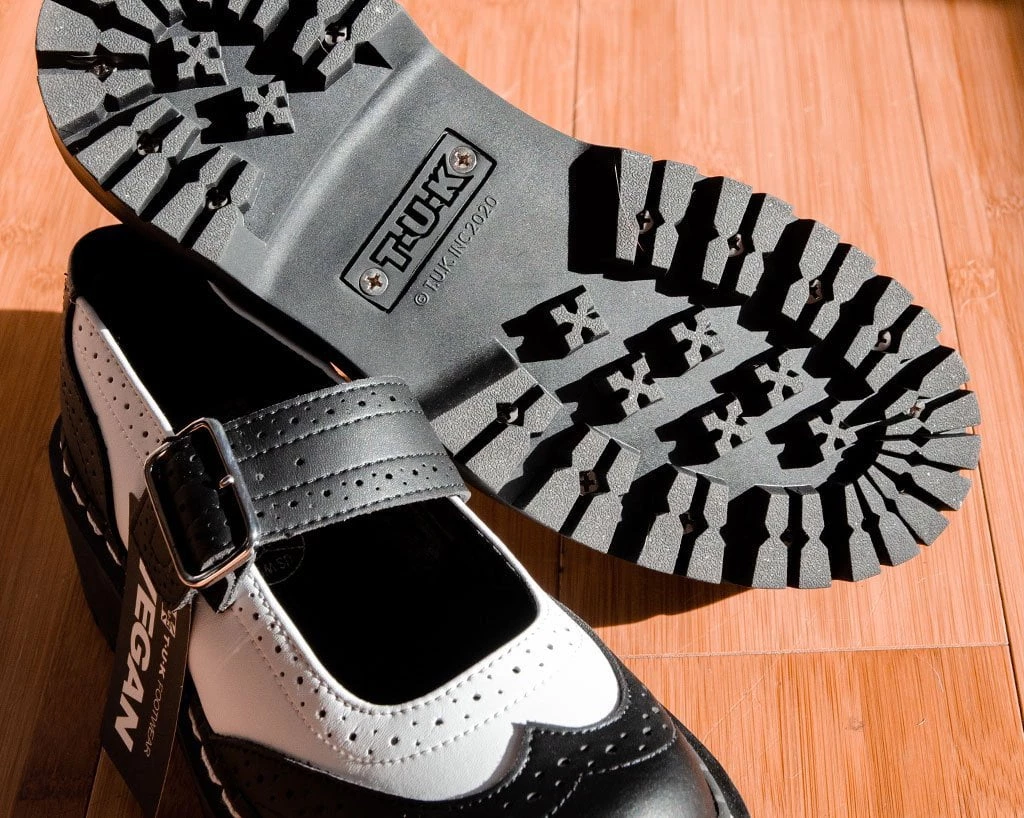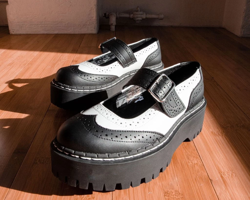 These platform Mary Janes add the perfect edge to any outfit. Has a black & white brogue upper made of our high quality TUKskin™ material — polishable synthetic faux leather that is both soft and breathable. Features a platform height that stands at 2” with screws in the sole for extra allure. Comes with removable memory foam insoles for added comfort.