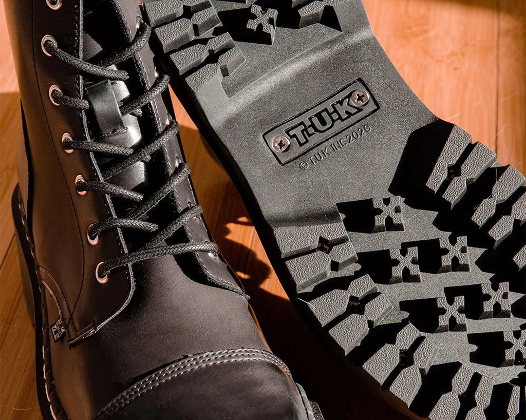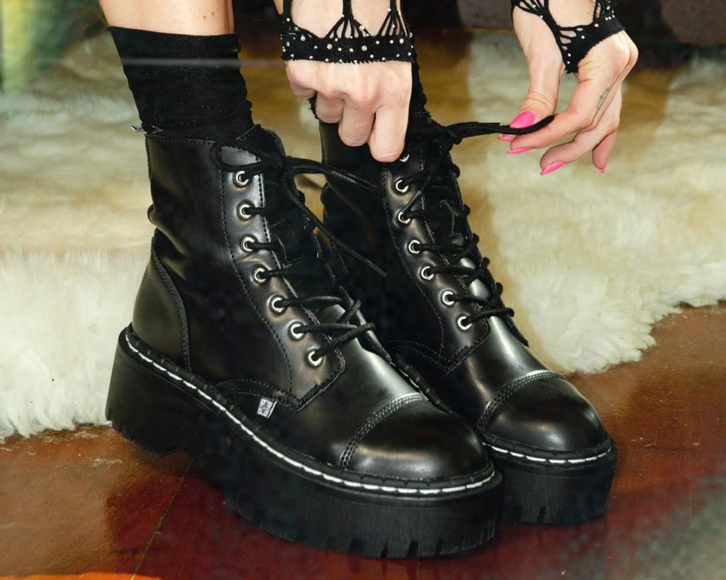 Shoes to match your personality. Has an all-black upper made of our high quality TUKskin™ material — polishable synthetic faux leather that is both soft and breathable. Features a 7-eyelet lace up detail and a platform height that stands at 2”. Has screws in the sole for extra allure. Comes with removable memory foam insoles for added comfort.