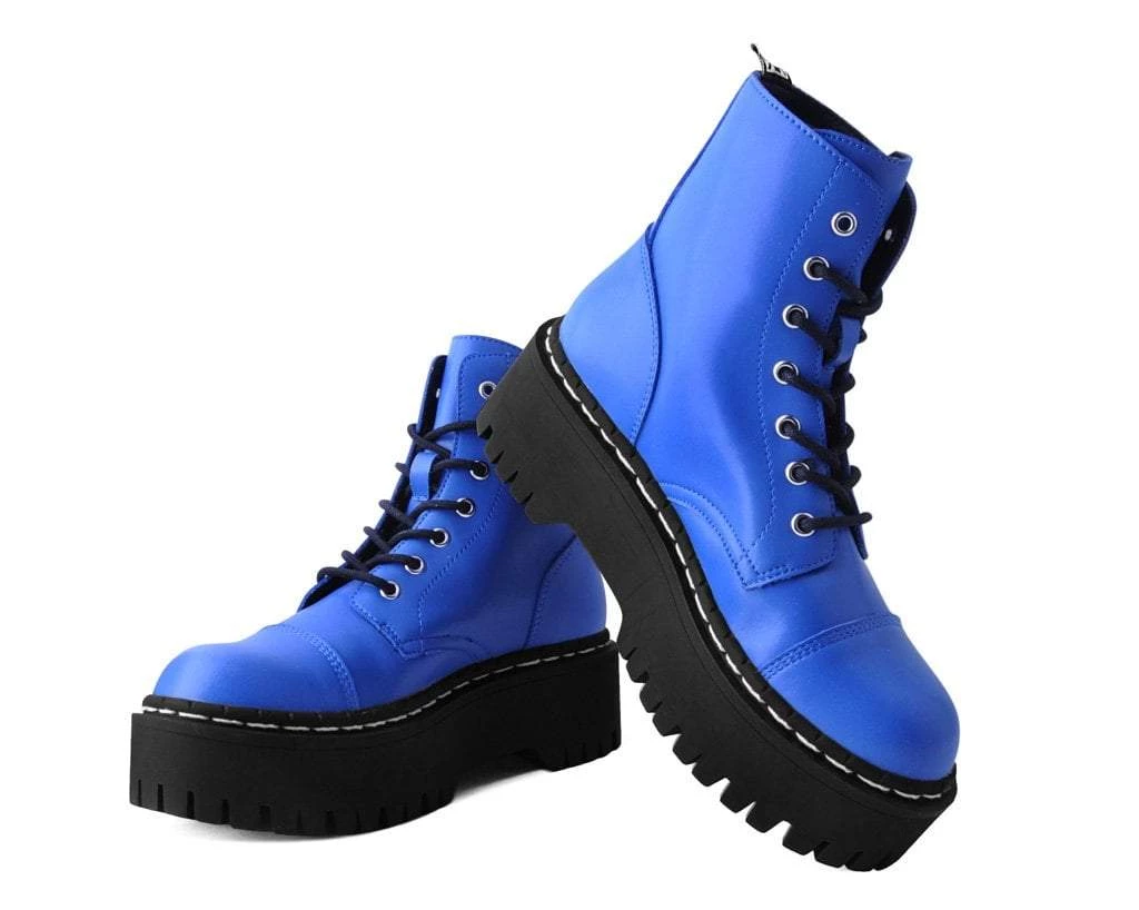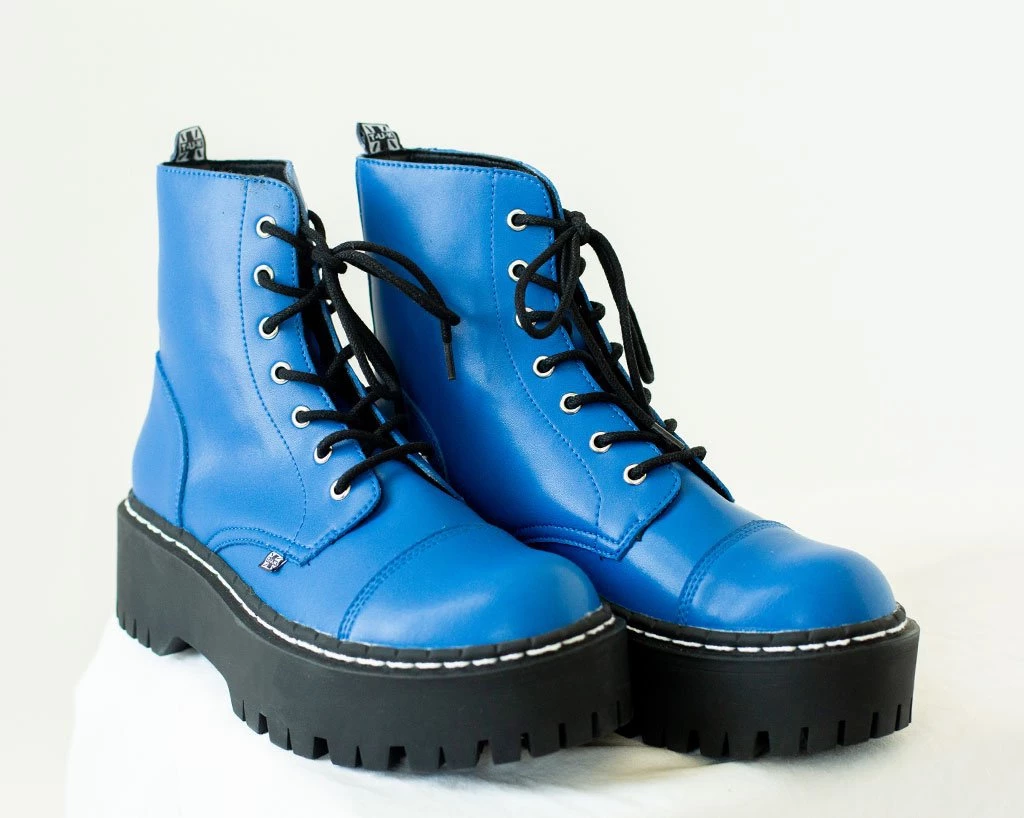 Shoes to match your personality. Features a matte electric blue upper with a 7-eyelet lace up detail and a platform height that stands at 2”. Has screws in the sole for extra allure. Comes with removable memory foam insoles for added comfort.