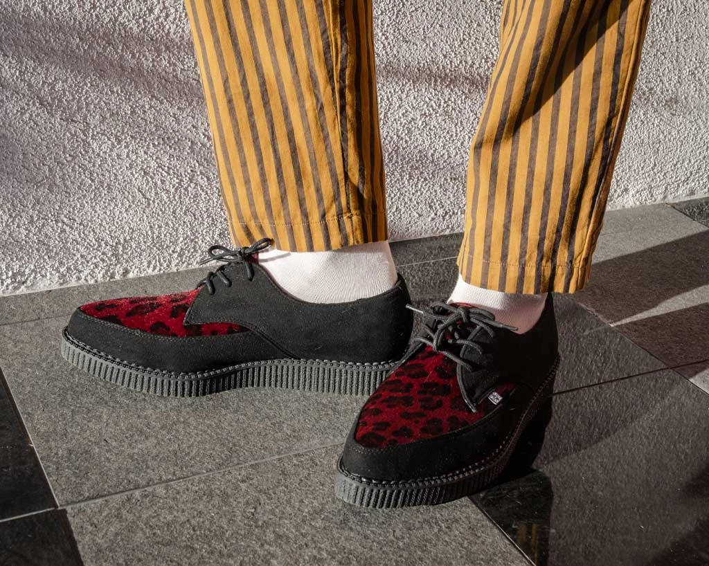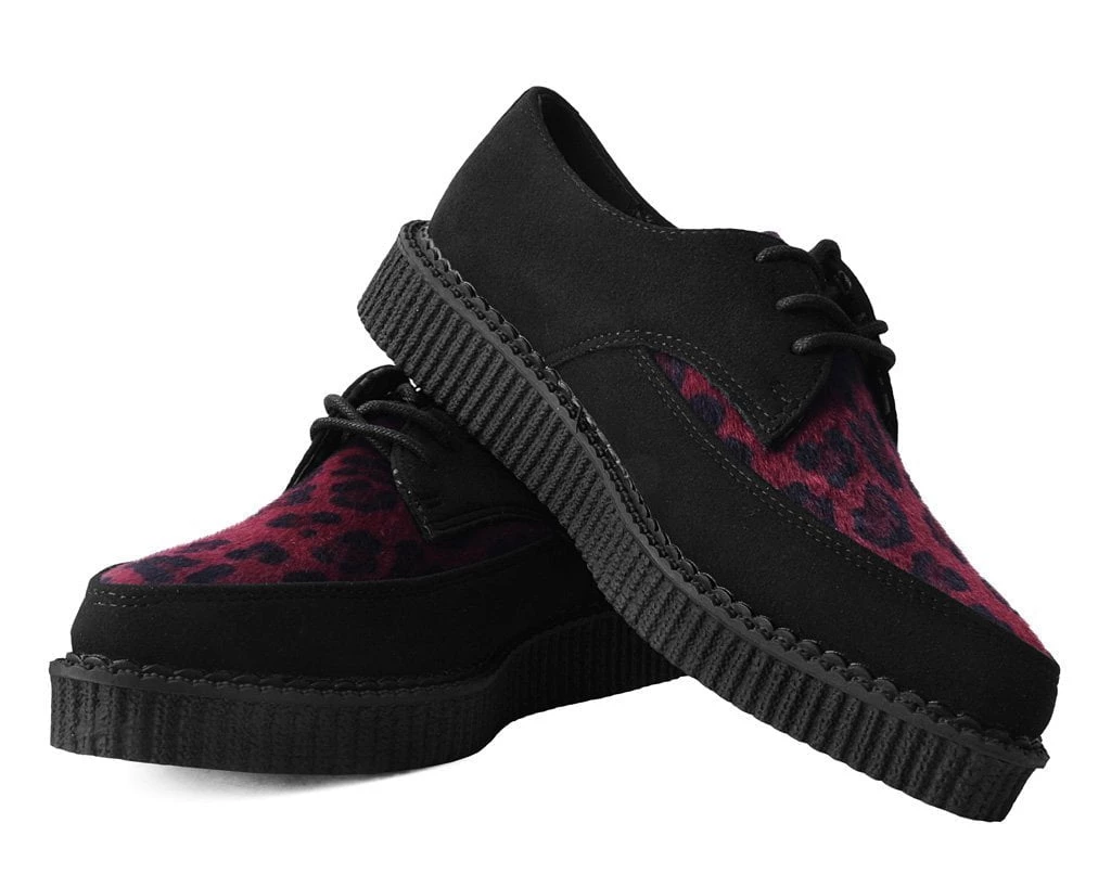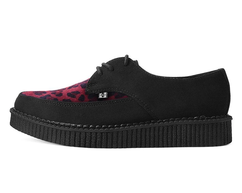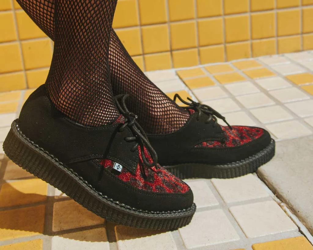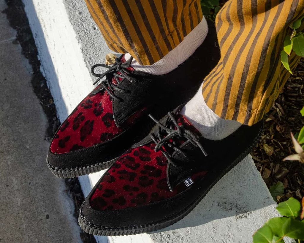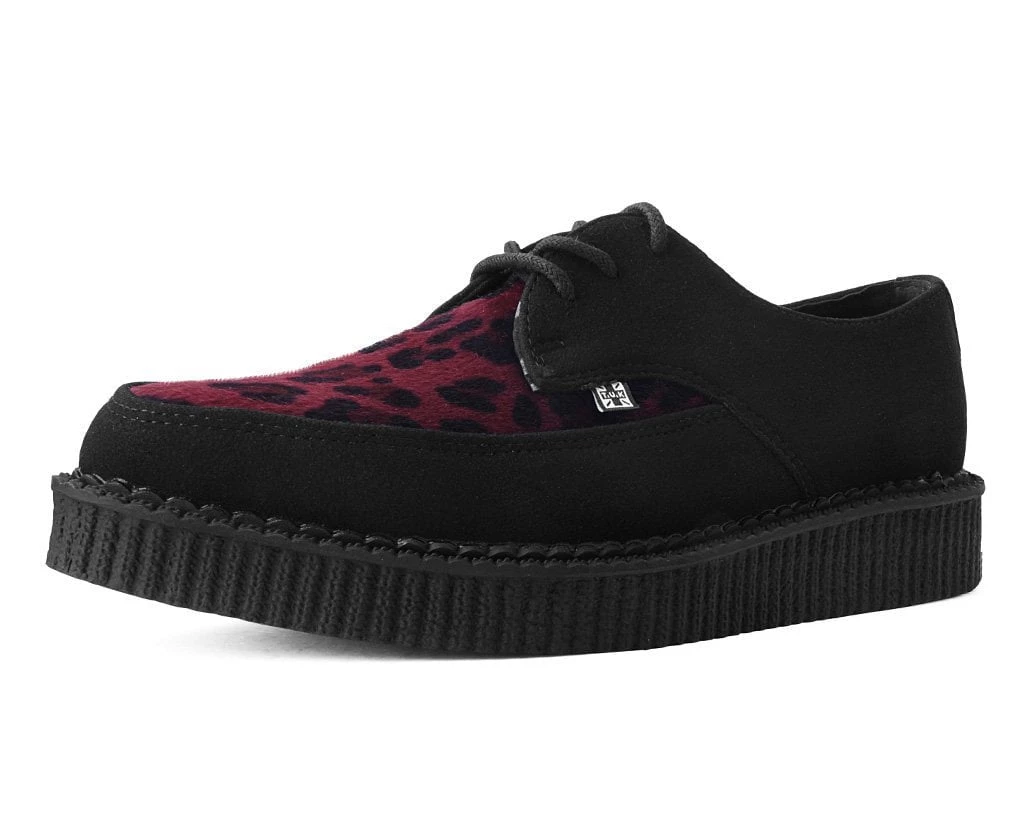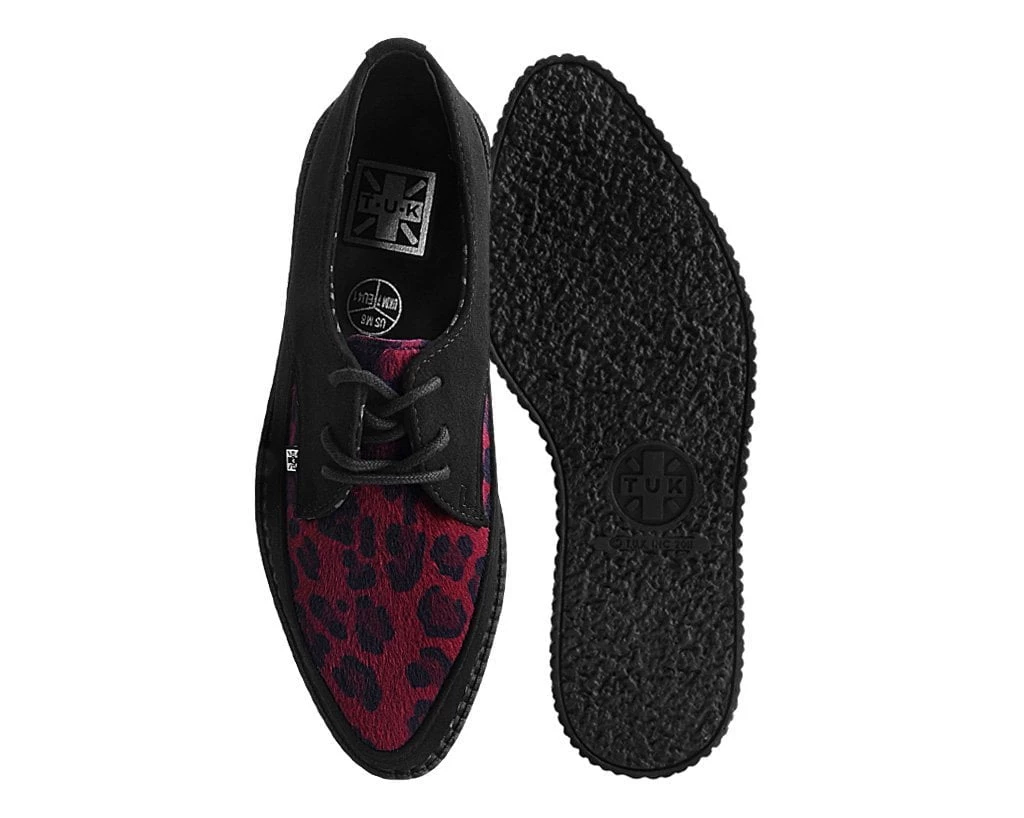Add some punk to your style. Upper features black & red leopard upper & Lace up closure. The T.U.K. Pointed Creeper sole is about 1 1/4 inches high.