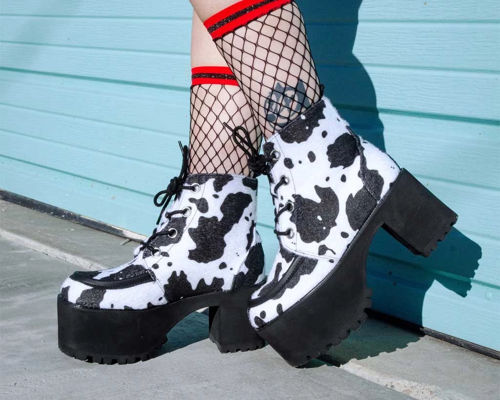 Add 3.5” of style to your step today! These durable and fashion forward platform boots provide an added lift to your style and are surprisingly easy to walk in! The cow print upper is vegan friendly and made with eye-catching oversized silver eyelets. These boots are true vegan shoes for the environmentally conscious shoe shopper! These shoes are a huge hit around the T.U.K. office!