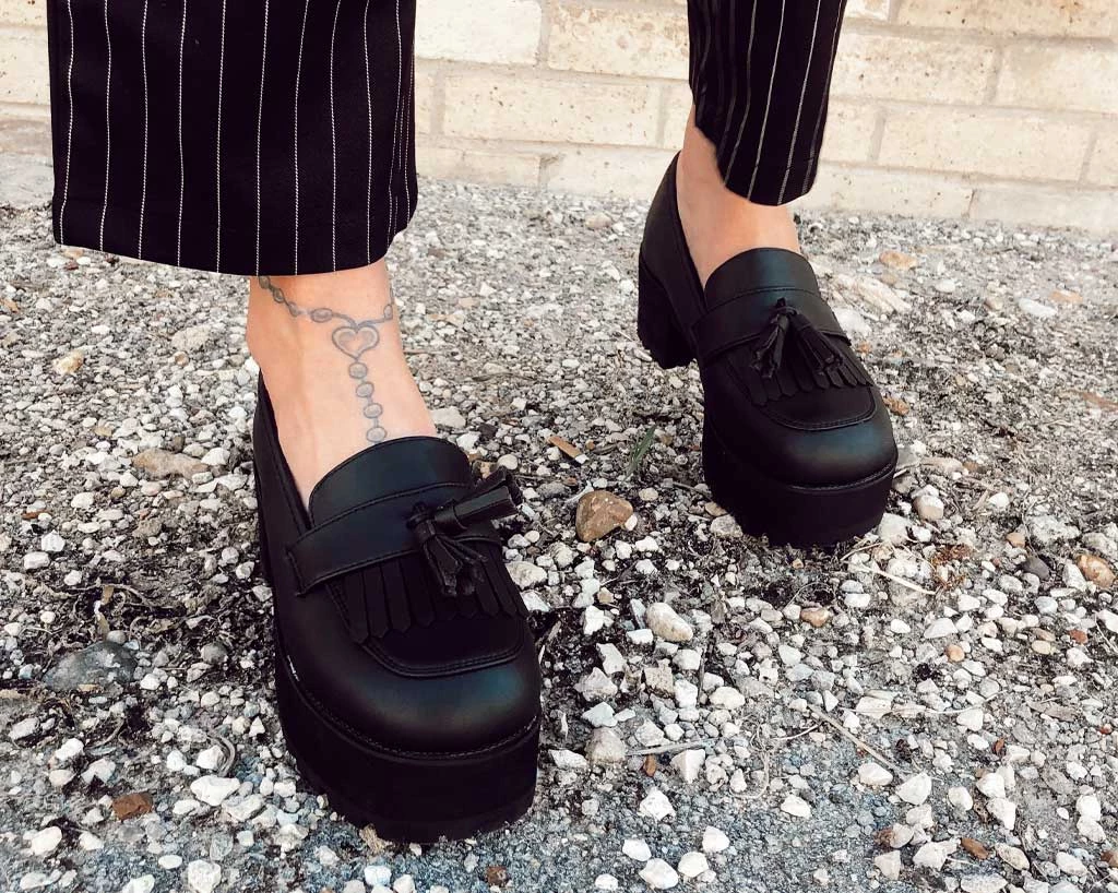 This seasons fav – a stylish loafer with a lift. These slip-on loafer heels have a have an all-black upper made of our high quality TUKskin™ material — polishable synthetic faux leather that is both soft and breathable. Made of a vegan friendly upper and sits on top of sole that’s 2 1/2” heel and 1 3/4” front.