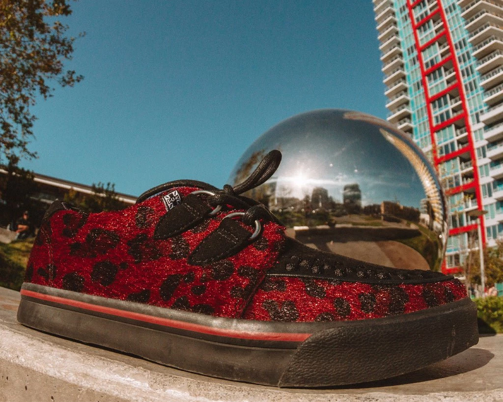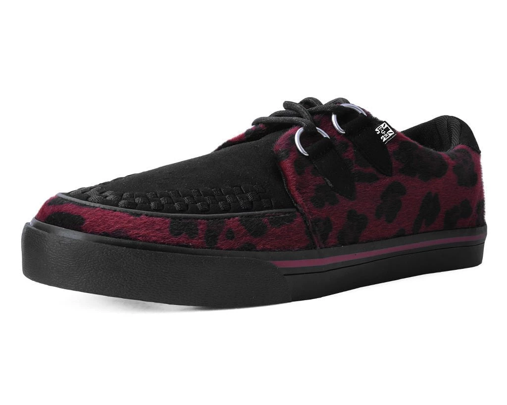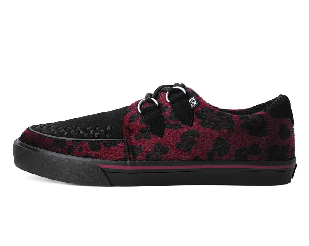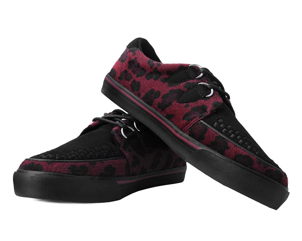 Normal is boring! Get ready to hit the stage or the streets in these vulcanized sneakers that reimagines our former creeper sneaker silhouette with bold & modern twists. Features one of our crowd-pleasing upper styles in a burgundy leopard hair with classic D-rings & iconic interlace detailing along the front.
