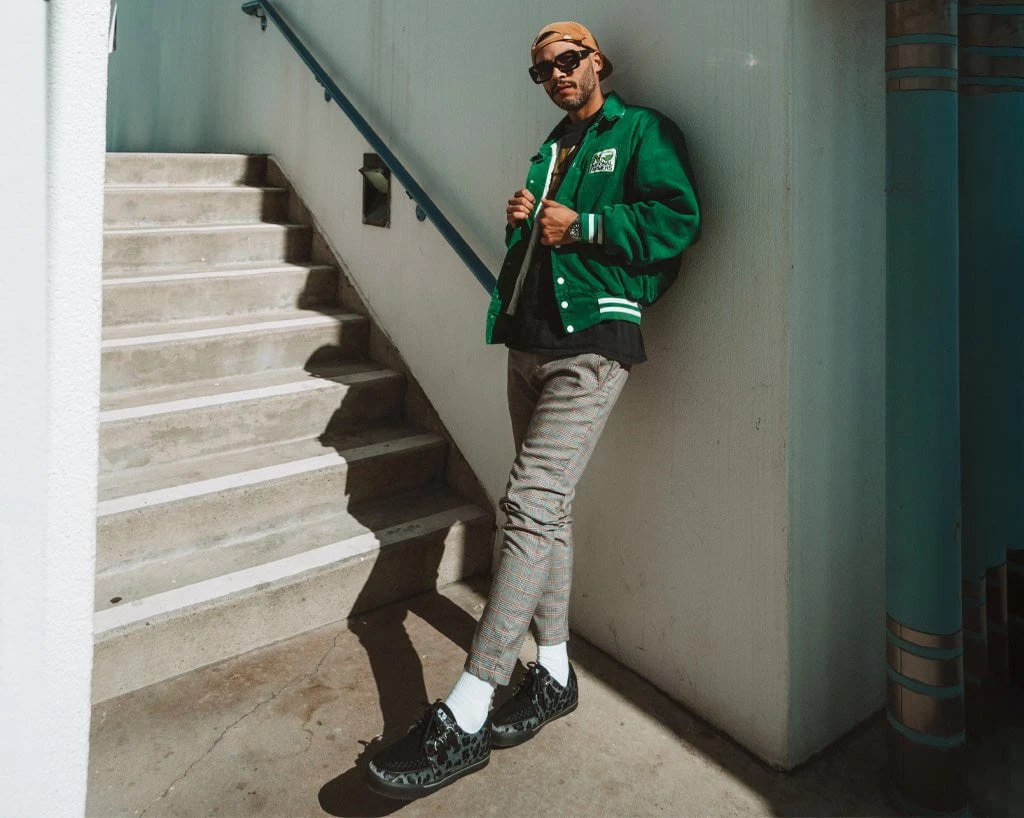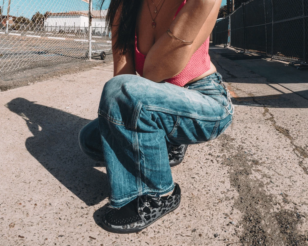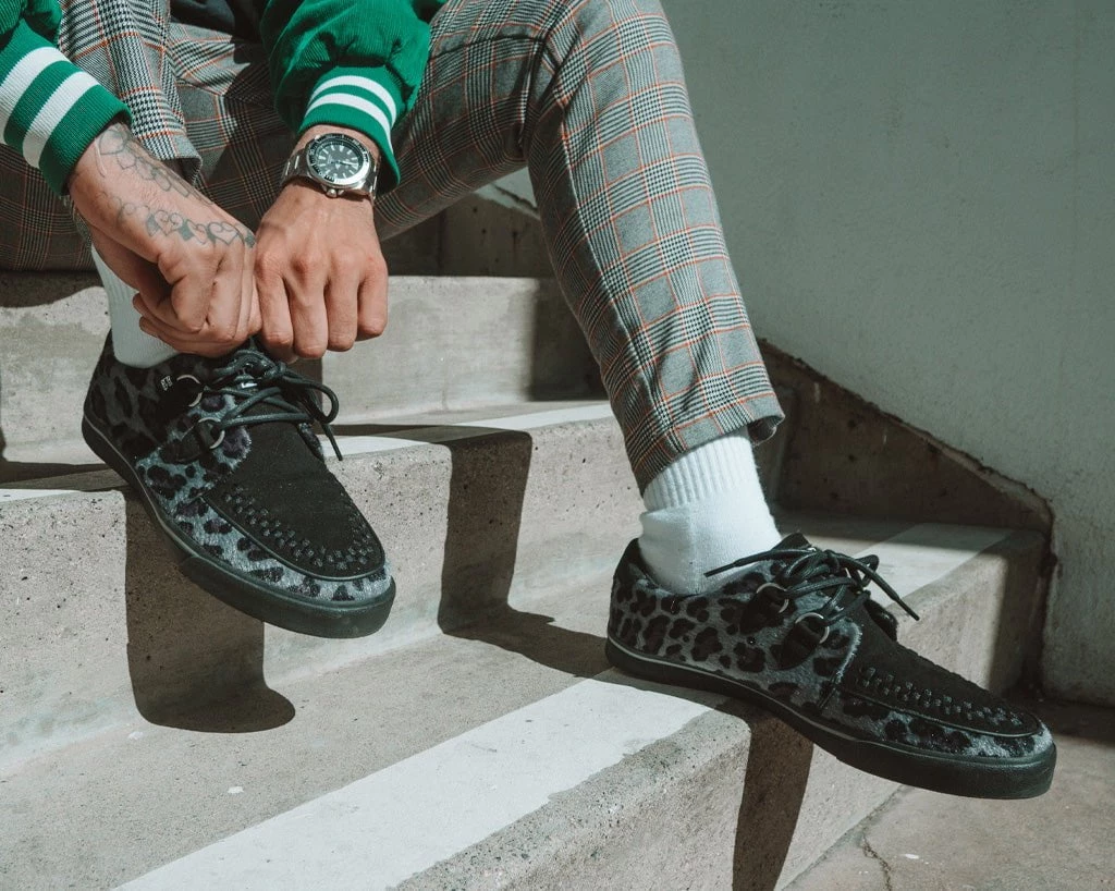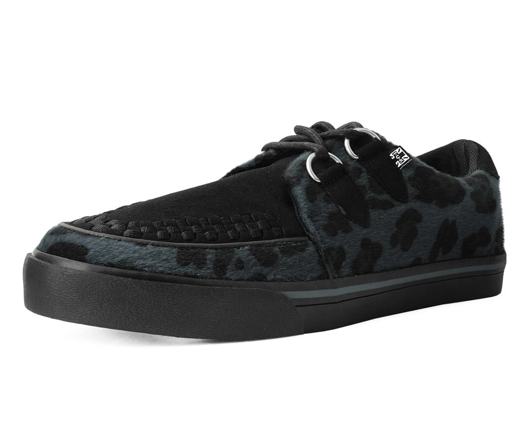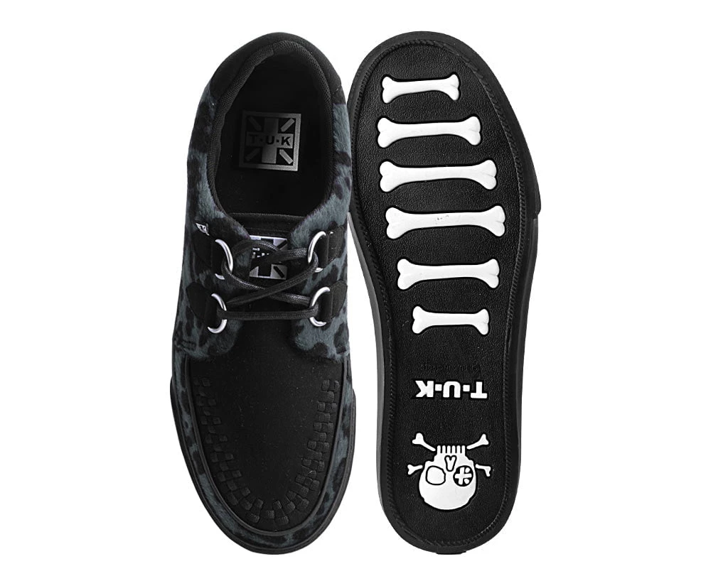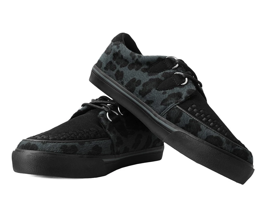Normal is boring! Get ready to hit the stage or the streets in these vulcanized sneakers that reimagines our former creeper sneaker silhouette with bold & modern twists. Features one of our crowd-pleasing upper styles in a grey leopard hair with classic D-rings & iconic interlace detailing along the front.