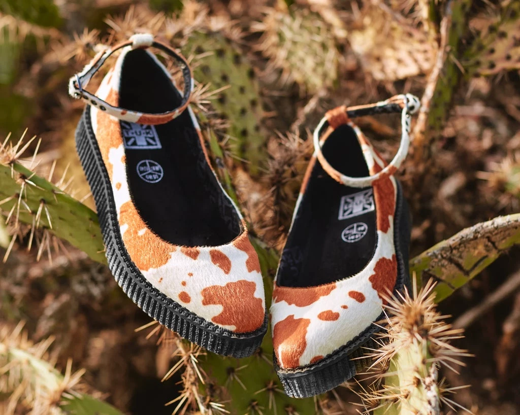 These vegan friendly mary janes are essentials. Features a vegan friendly cow print upper with pointed toe construction and ankle strap closure for an adjustable fit. Sits on top of a low sole creeper platform that measures 1 1/4” at the heel and 3/4” in the front. Has removable memory foam padding for added comfort.