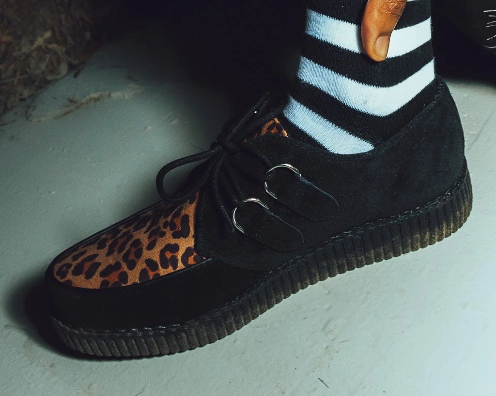 Iconic style that won’t quit. The timeless creeper that you know and love is back featuring a new sleeker sole that is more lightweight and flexible than ever. Features a low platform height that is approximately 1 ¼” at the heel and ¾” in the front and is made of a mixture of EVA and rubber that contributes to the sole’s bendability. Has a cow suede black upper complemented by a leopard print vamp and removable memory foam insoles for added comfort.