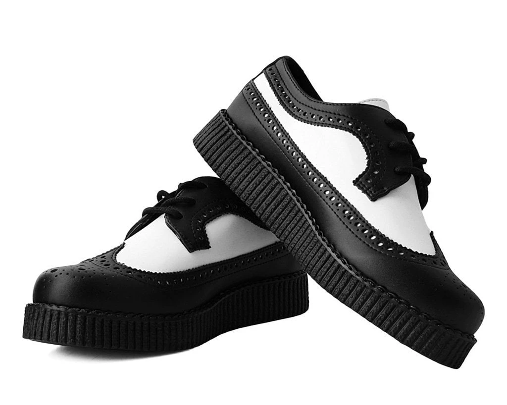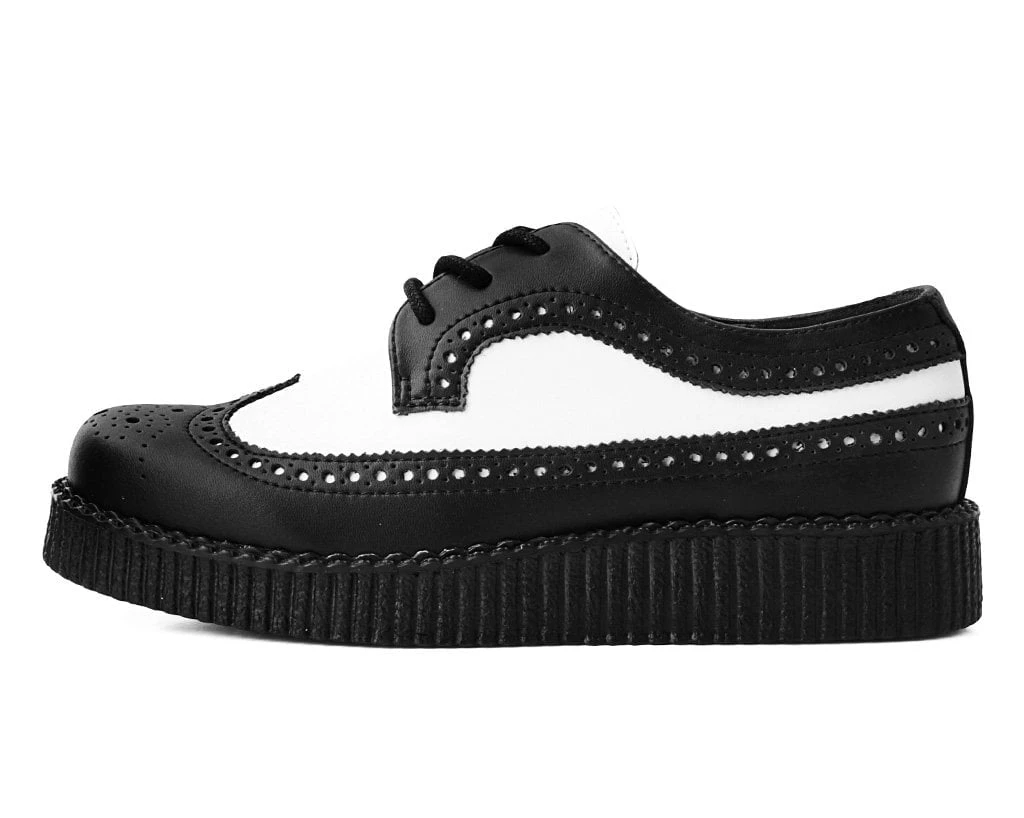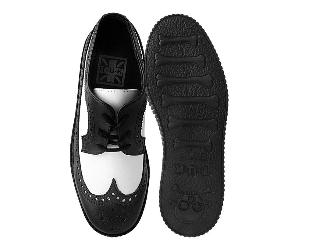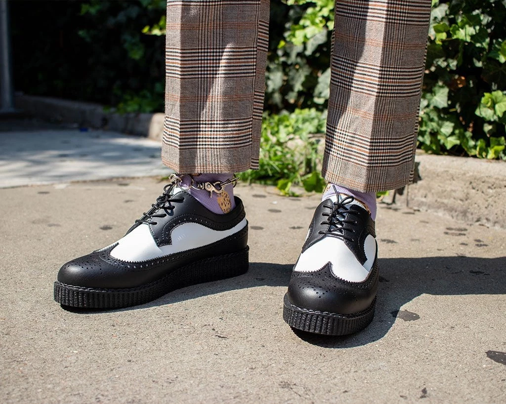 These classic wingtip creepers have a retro style with a modern twist. The timeless creeper that you know and love is back featuring a new sleeker sole that is more lightweight and flexible than ever. Features a low platform height that is approximately 1 ¼” at the heel and ¾” in the front and is made of a mixture of EVA and rubber that contributes to the sole’s bendability. Has an all-black upper made of our high quality TUKskin™ material — polishable synthetic faux leather that is both soft and breathable. Comes with removable memory foam insoles for added comfort.
