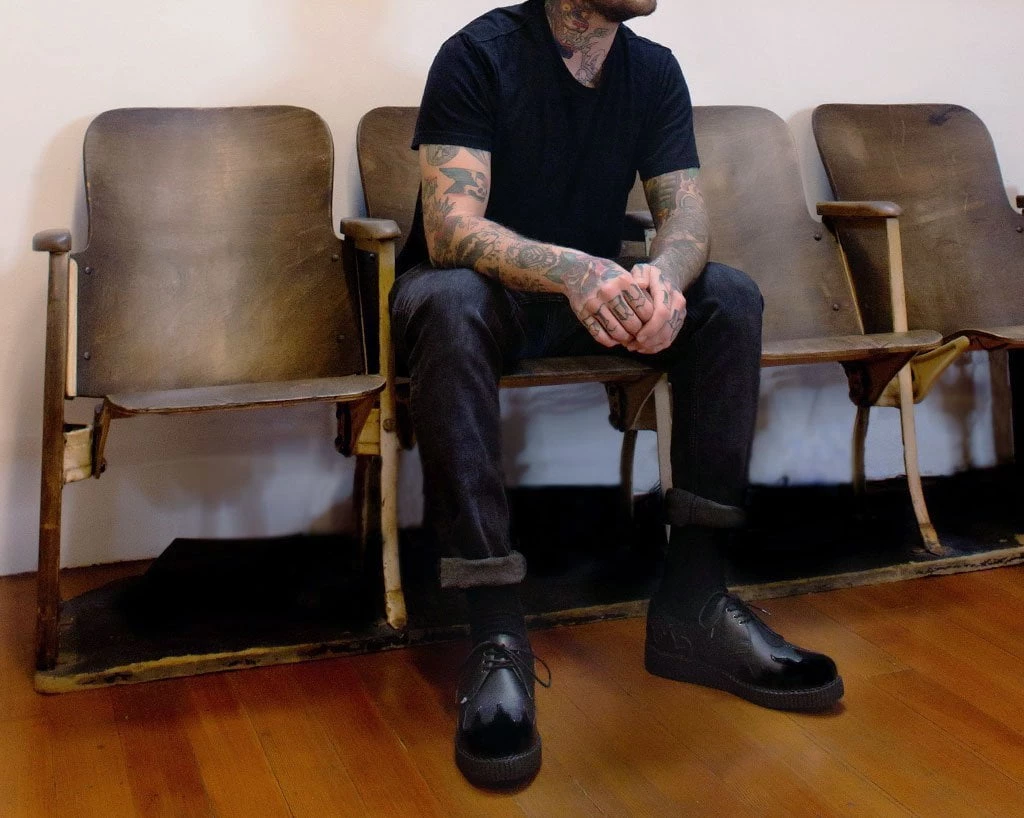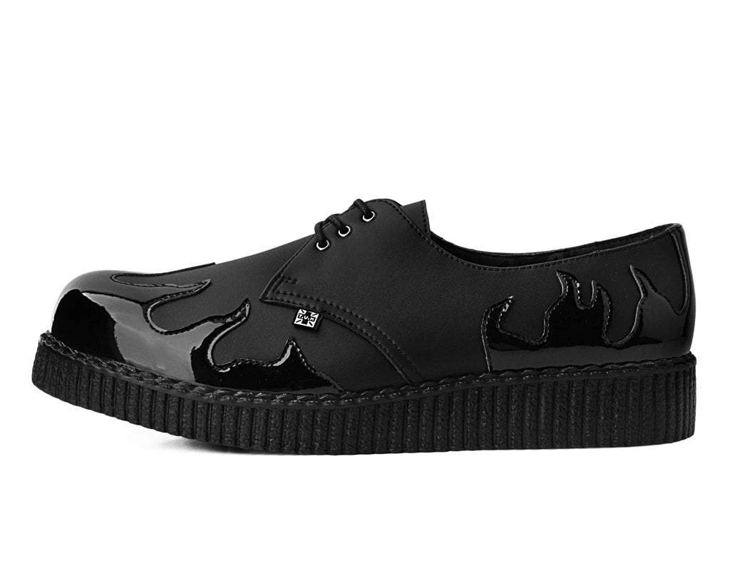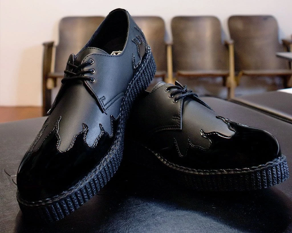 Add some heat to your step. Features an all-black upper with patent flames over the toes and heels. Made of our high quality TUKskin™ material — polishable synthetic faux leather that is both soft and breathable. Has lace-up fastening with a low sole platform that measures approximately 1 ¼” at the heel and ¾” in the front. Includes removable gel insoles for added comfort. Shoe can be easily cleaned with mild soap and water.