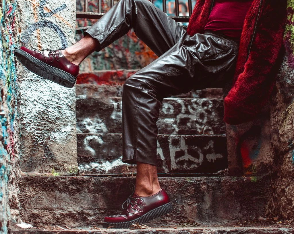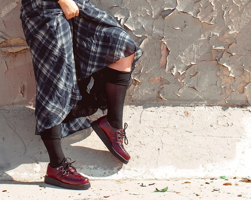 Iconic style that won’t quit. The timeless creeper that you know and love is back featuring a new sleeker sole that is more lightweight and flexible than ever. Features a low platform height that is approximately 1 ¼” at the heel and ¾” in the front and is made of a mixture of EVA and rubber that contributes to the sole’s bendability. Has a burgundy rub off upper made of our high quality TUKskin™ material — polishable synthetic faux leather that is both soft and breathable. Comes with removable memory foam insoles for added comfort.
