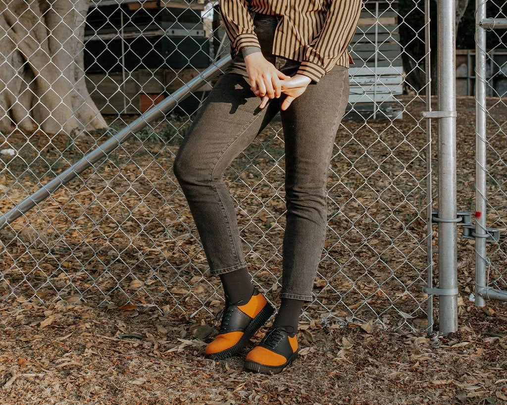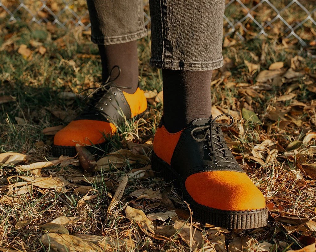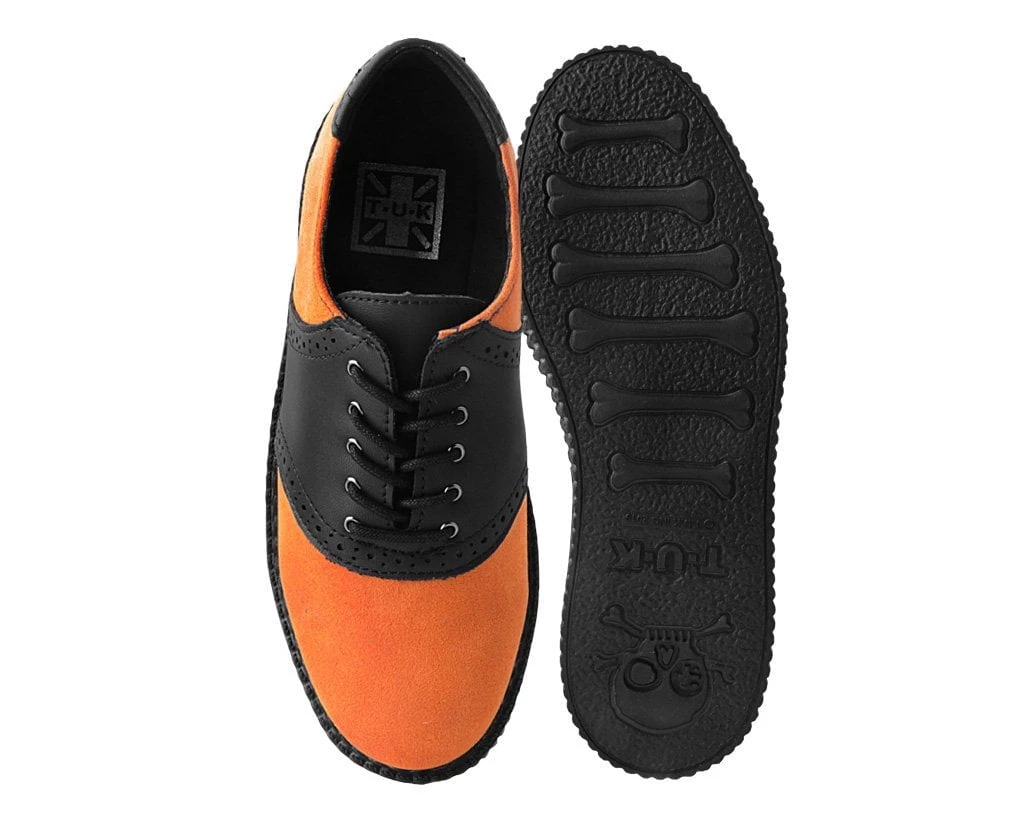 Give your wardrobe a color update with these orange saddle shoes. Features the vintage brogue detailing that will bring your casual outfits to the next level. A timeless creeper that sits on a new sleeker sole that is more lightweight and flexible than ever. Features a low platform height that is approximately 1 ¼” at the heel and ¾” in the front and is made of a mixture of EVA and rubber that contributes to the sole’s bendability. Has a two-tone upper made of our high quality TUKskin™ material — polishable synthetic faux leather that is both soft and breathable. Comes with removable memory foam insoles for added comfort.