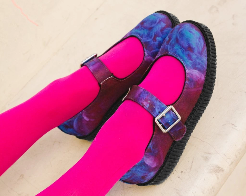Add a little punk to your everyday style. Features a low platform height that is approximately 1 ¼” at the heel and ¾” in the front and is made of a mixture of EVA and rubber that contributes to the sole’s bendability. Has cloud print fabric upper and comes with removable memory foam insoles for added comfort.