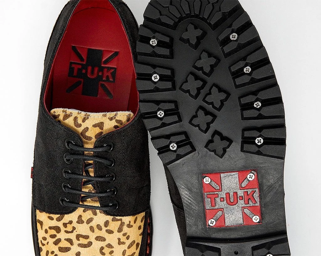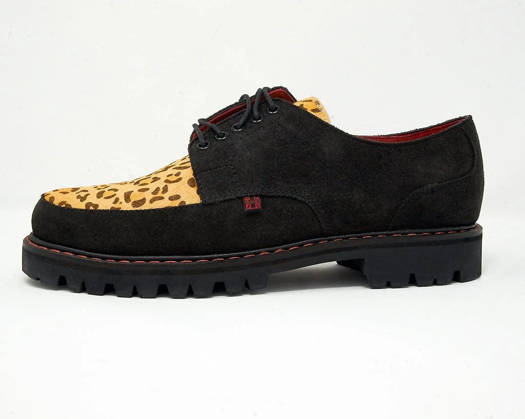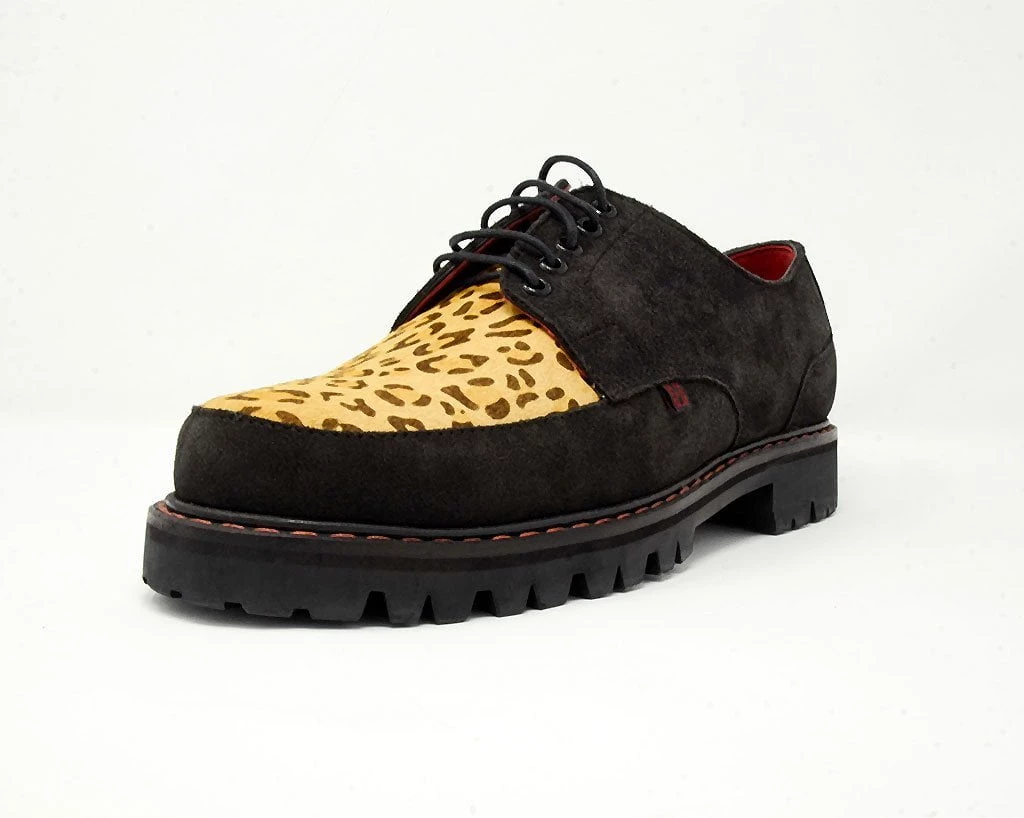 Features a black upper with light brown leopard on the vamp. Sits on a sole that’s approximately ¾’ in the front and 1 ¾’ at the heel.