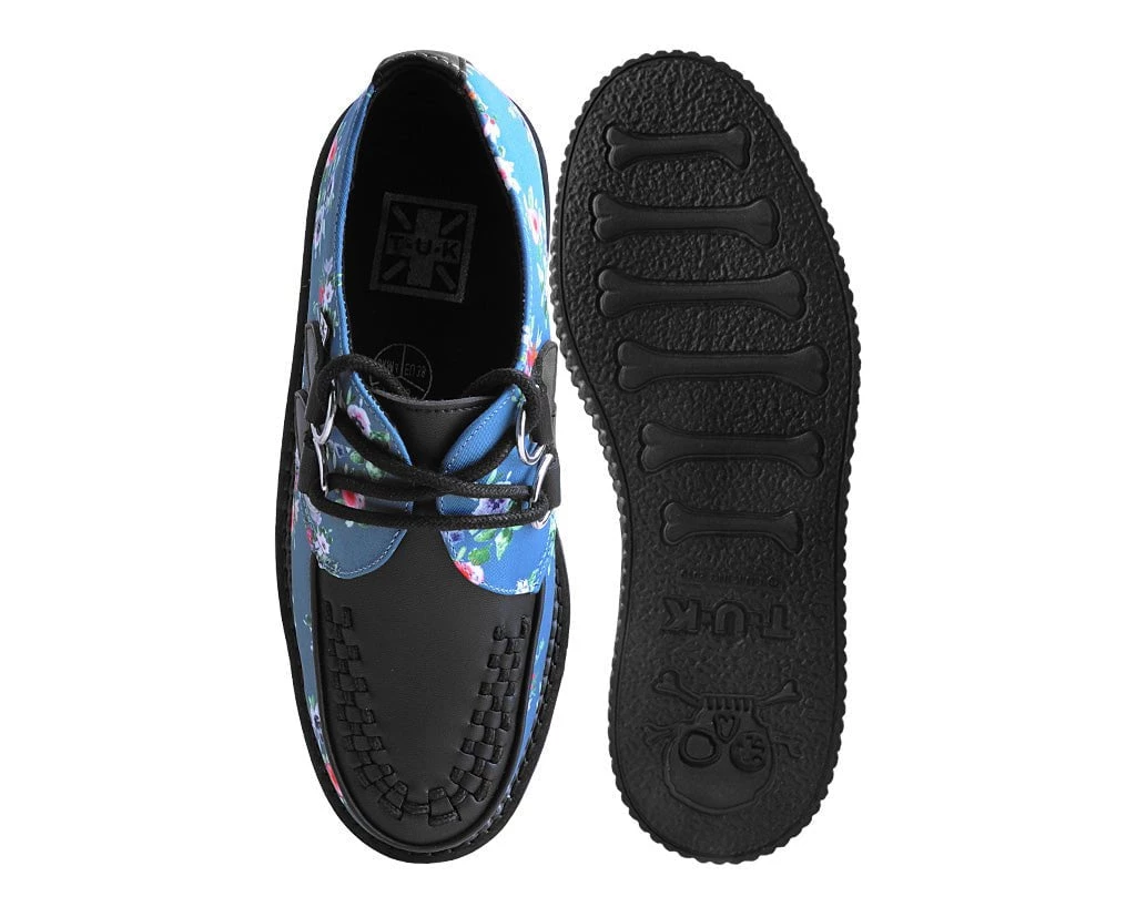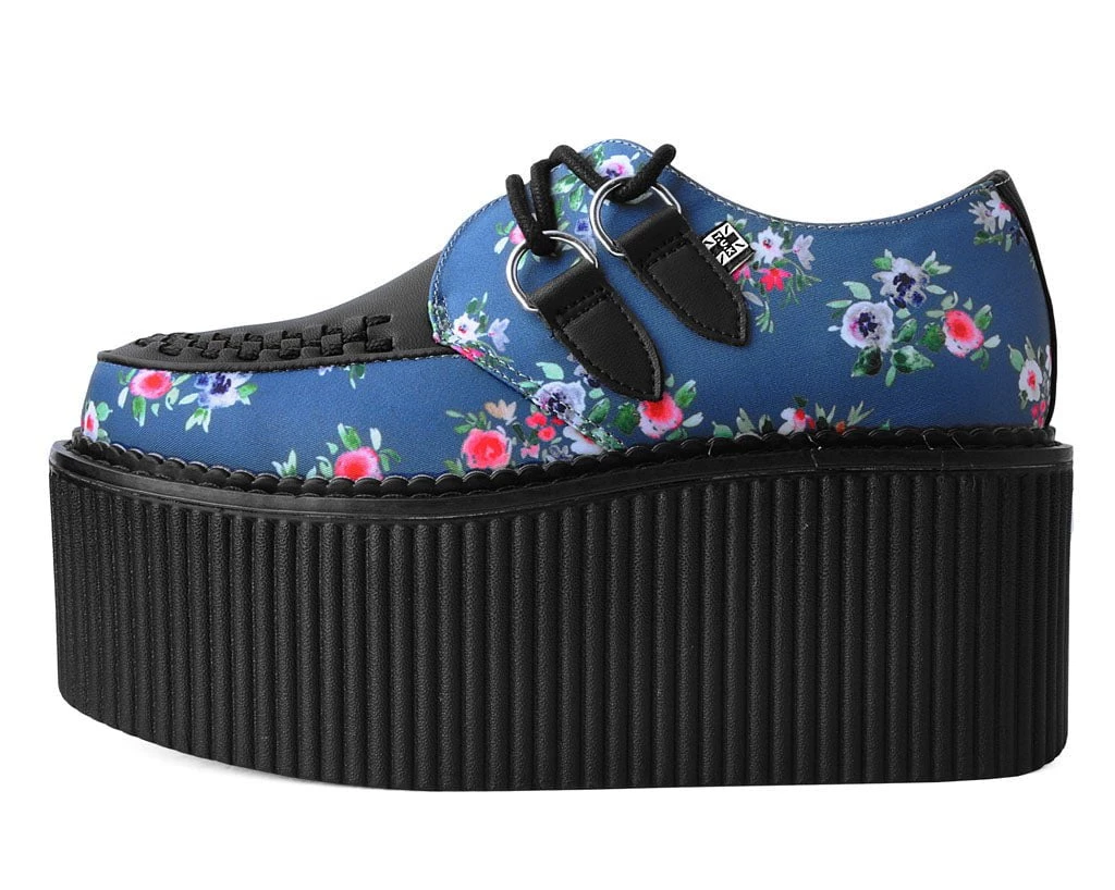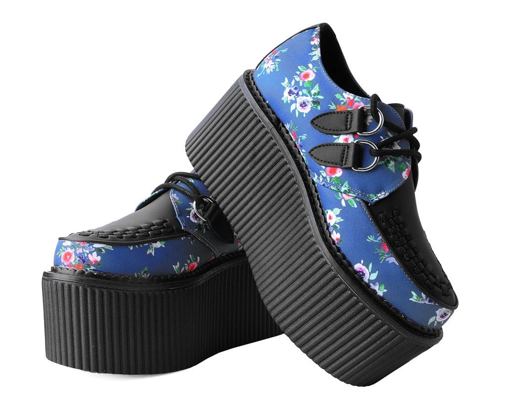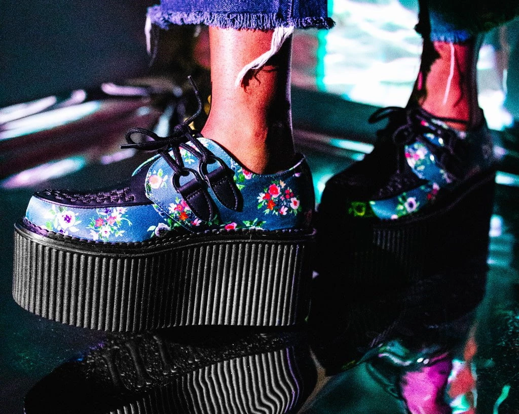 Shoes to stomp on hearts with. Features a floral fabric upper on our lightweight VIVA stratocreeper sole that has a platform height approximately 3” at the heel and 2.5” in the front. Includes removable memory foam padding for extra comfort.