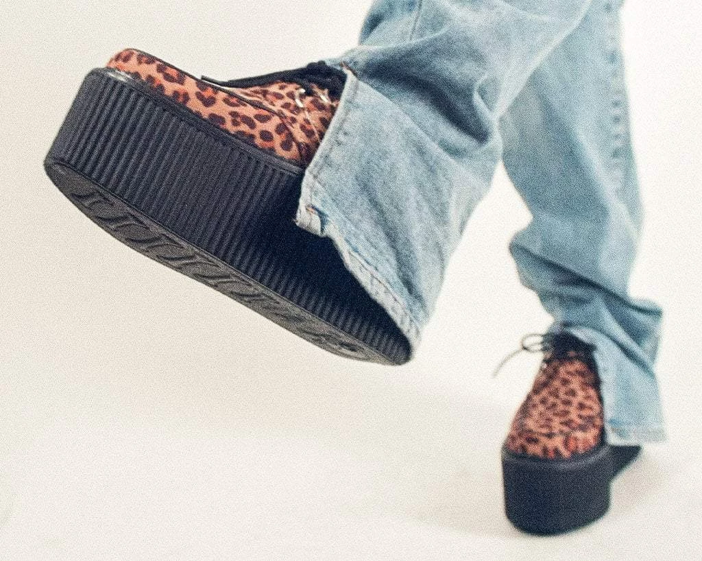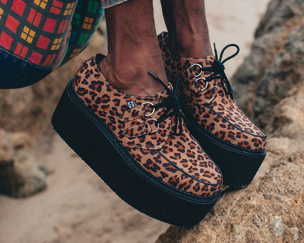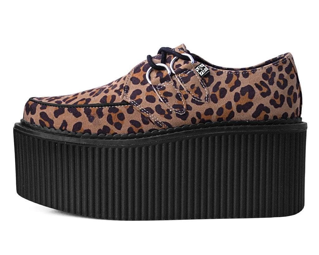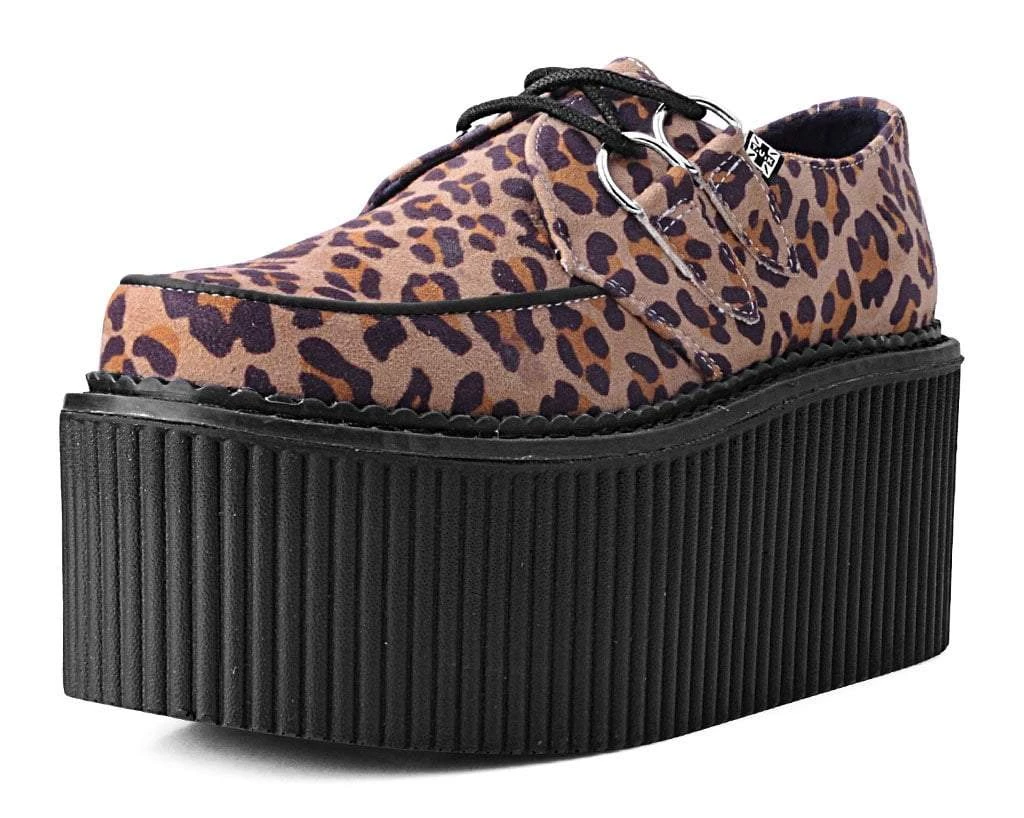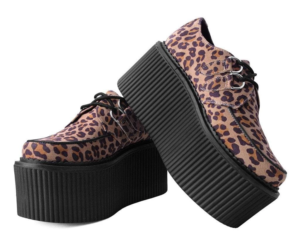 Shoes to stomp on hearts with. Features a faux leopard fabric upper on our lightweight VIVA stratocreeper sole that has a platform height approximately 3” at the heel and 2.5” in the front. Includes removable memory foam padding for extra comfort.