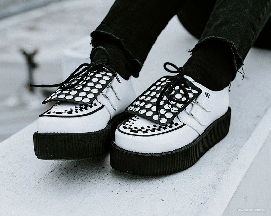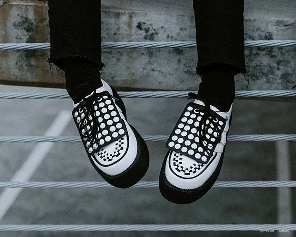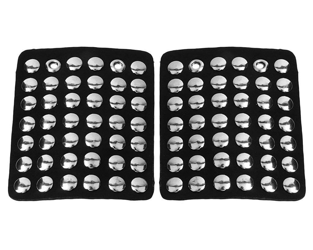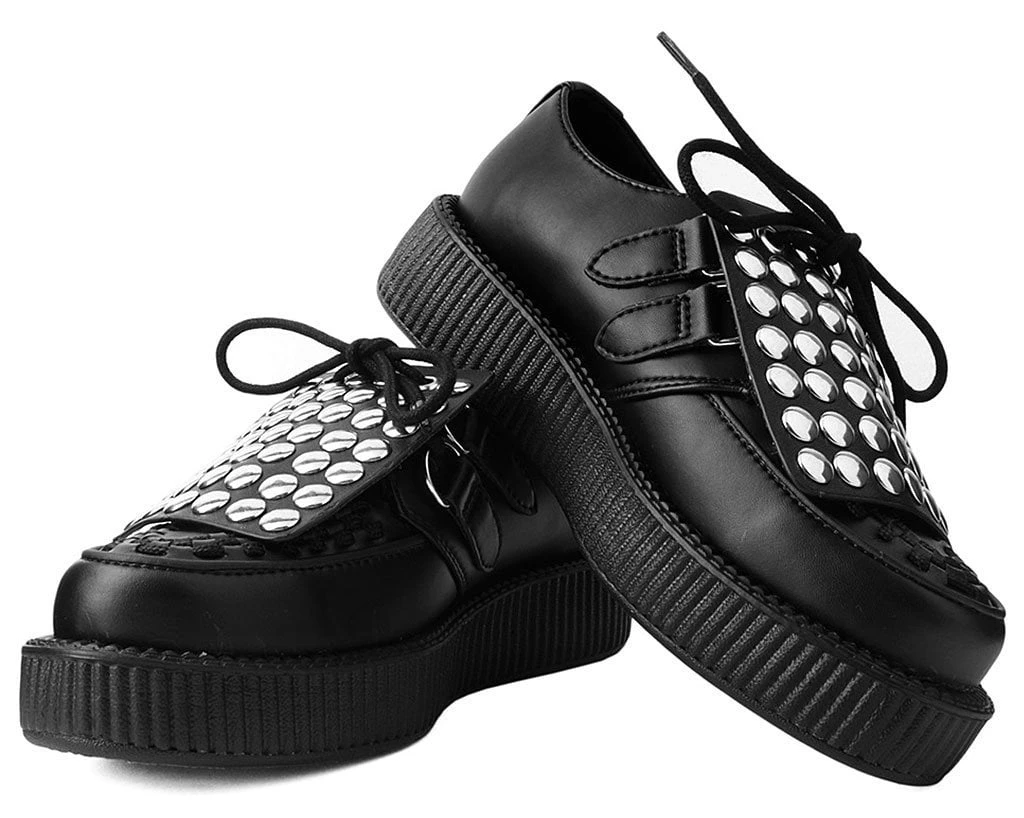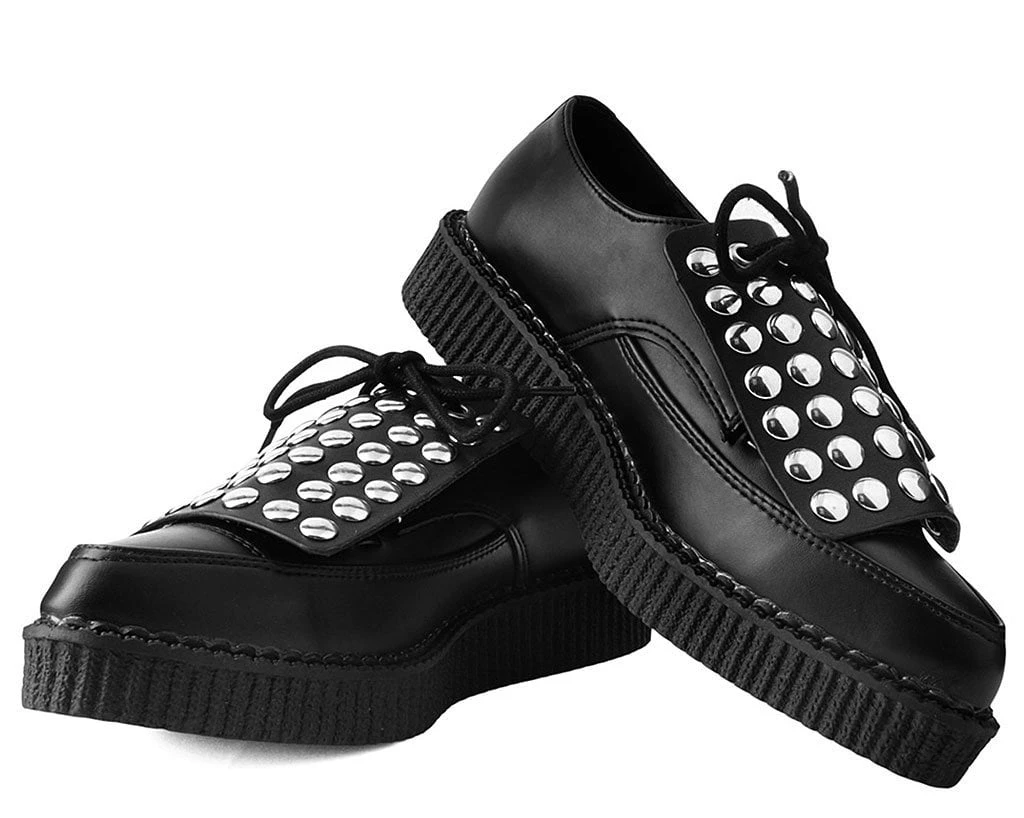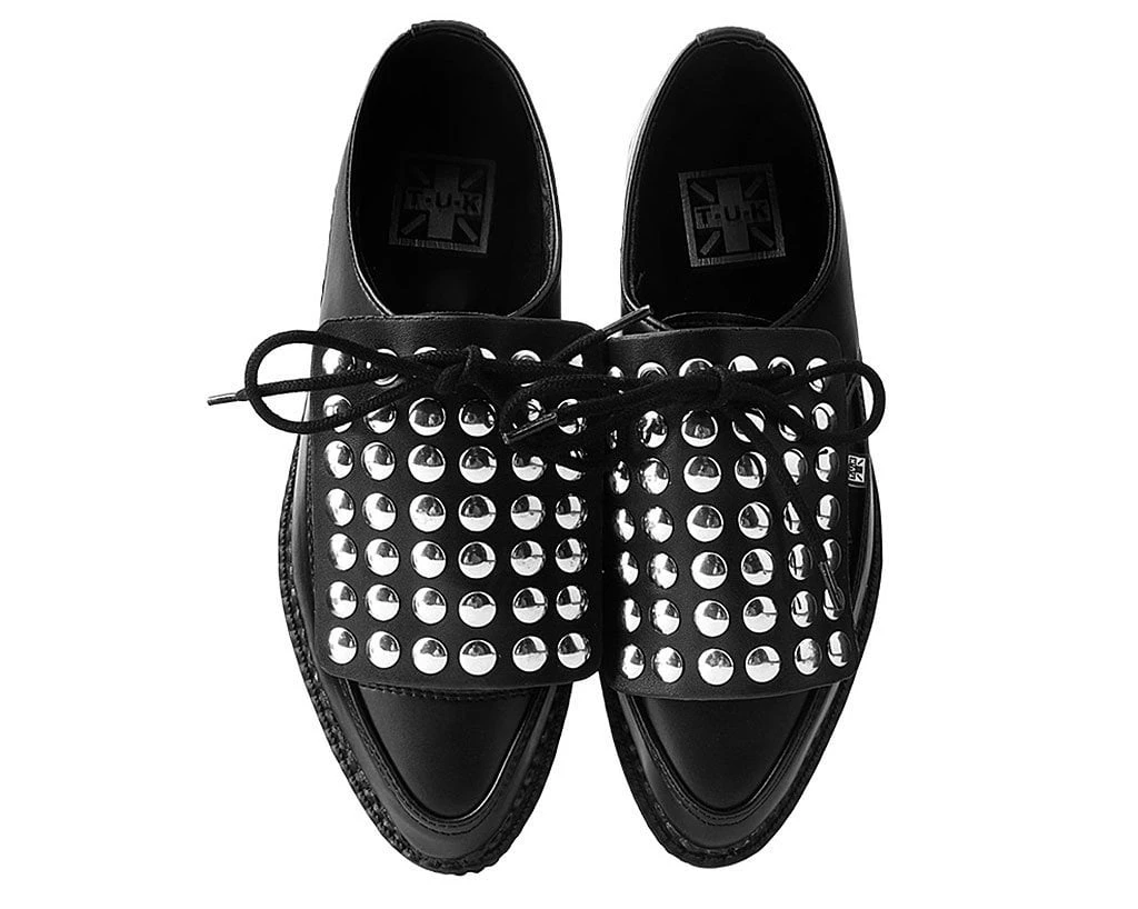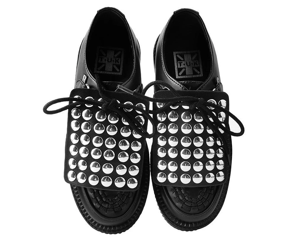 Add some versatility to your T.U.K.’s with this rad removable shoe apron featuring round silver studs throughout. Easily add them onto any of your creepers and sneakers that have shoe laces to give your kicks a totally different look. Comes in a pair of two.