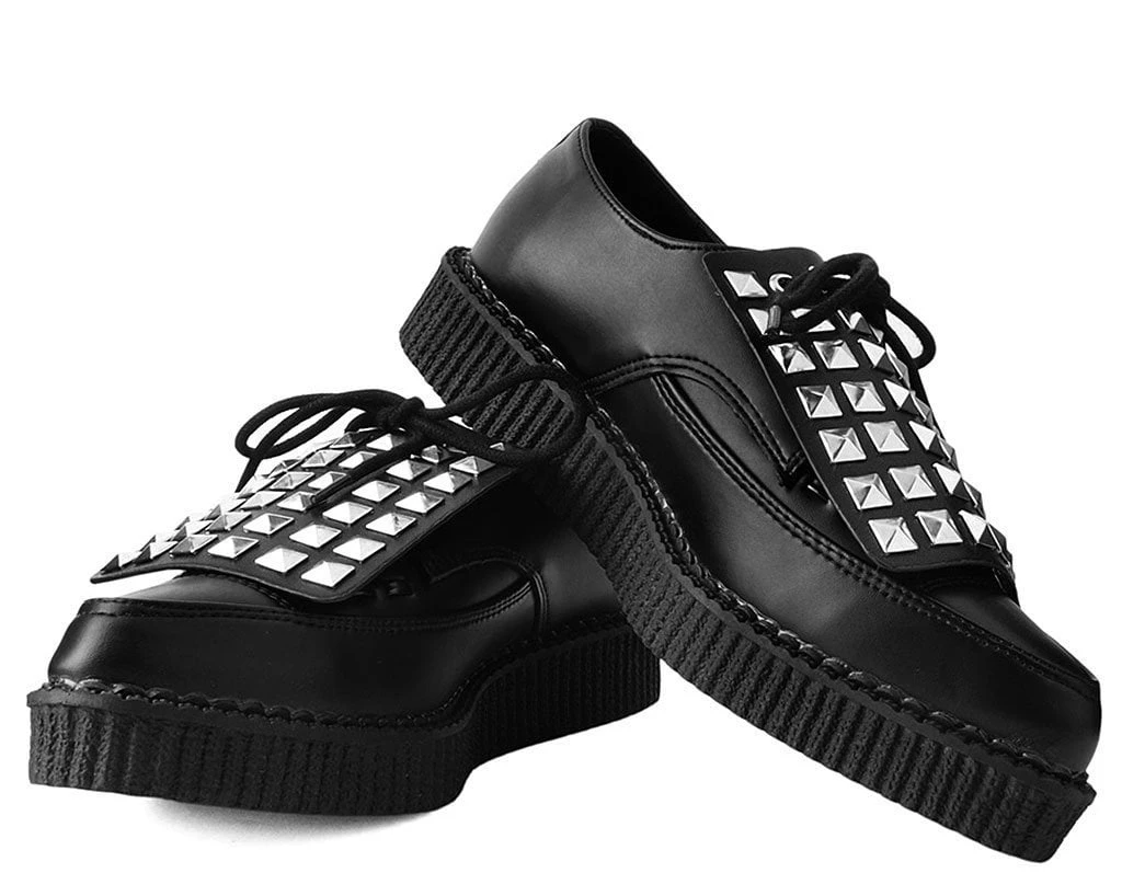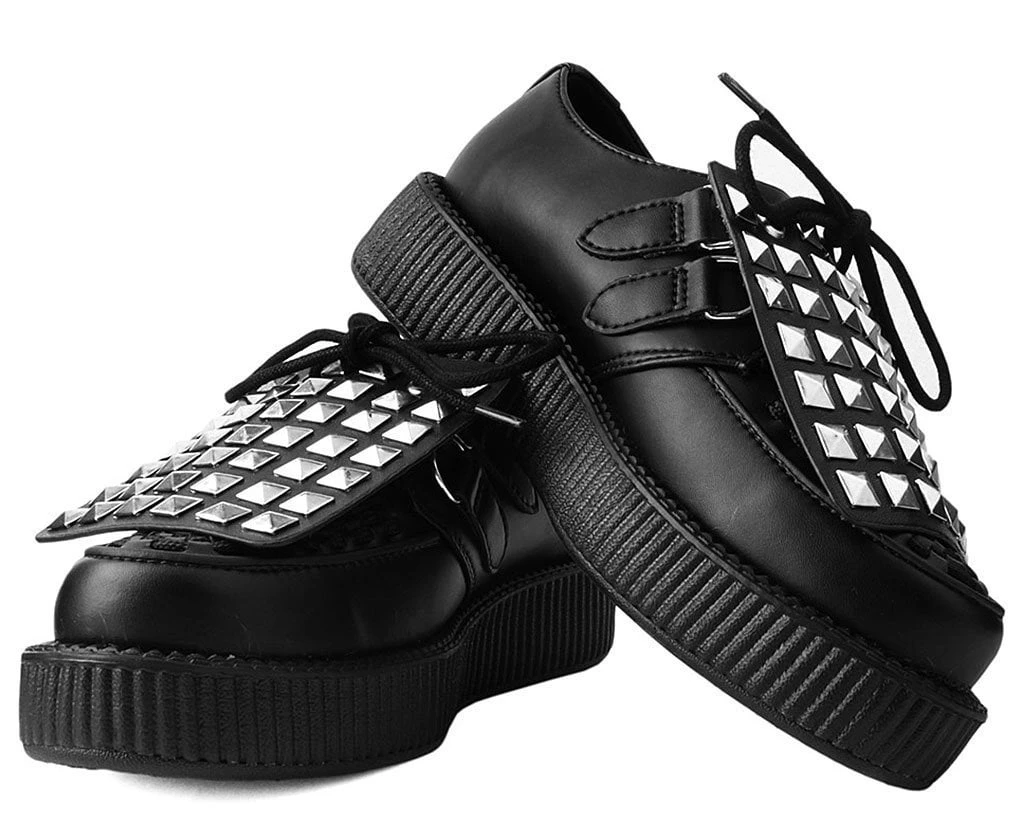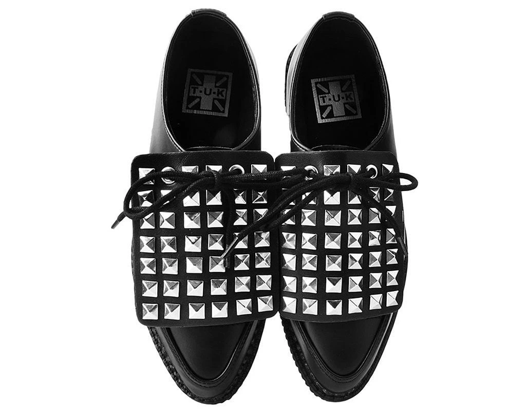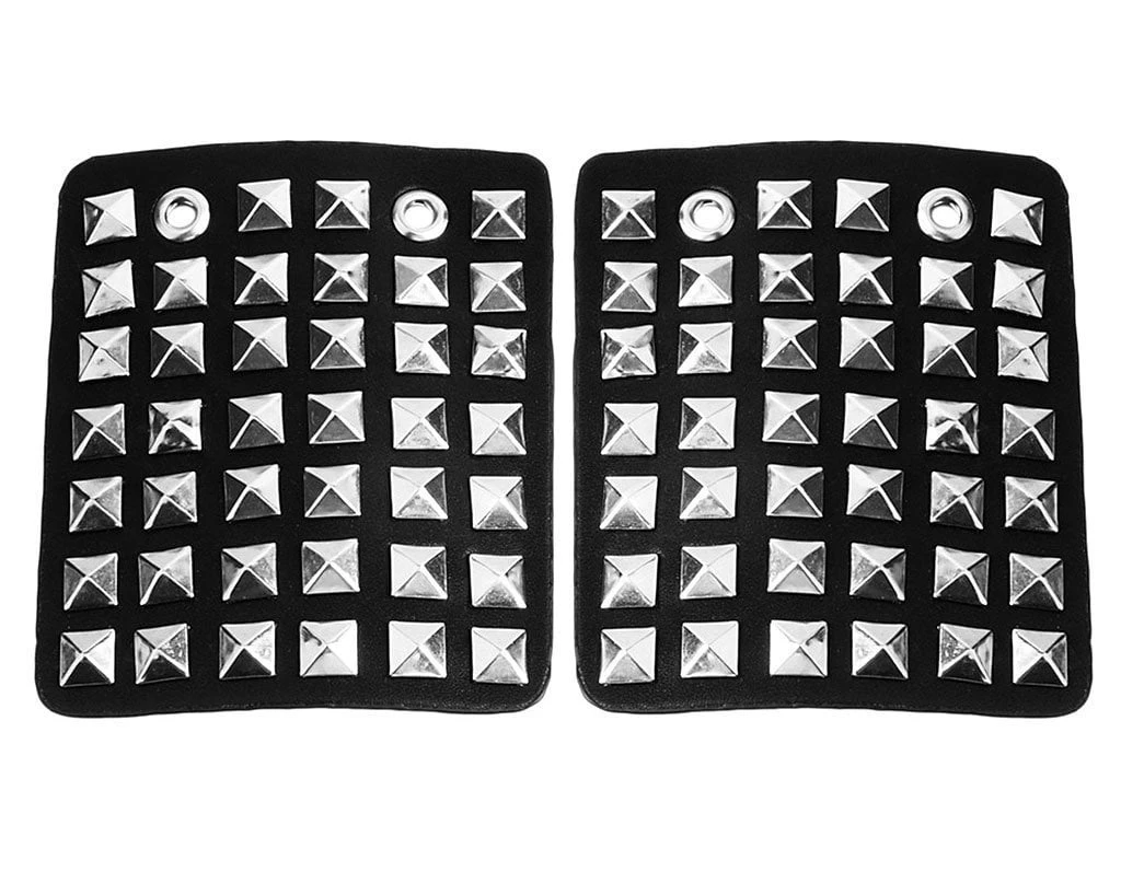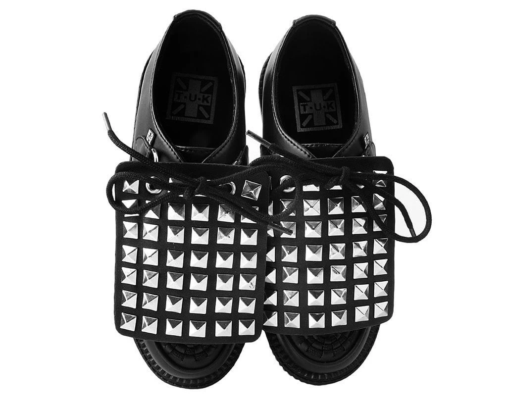 Add some versatility to your T.U.K.’s with this rad removable shoe apron featuring pyramid silver studs throughout. Easily add them onto any of your creepers and sneakers that have shoe laces to give your kicks a totally different look. Comes in a pair of two.