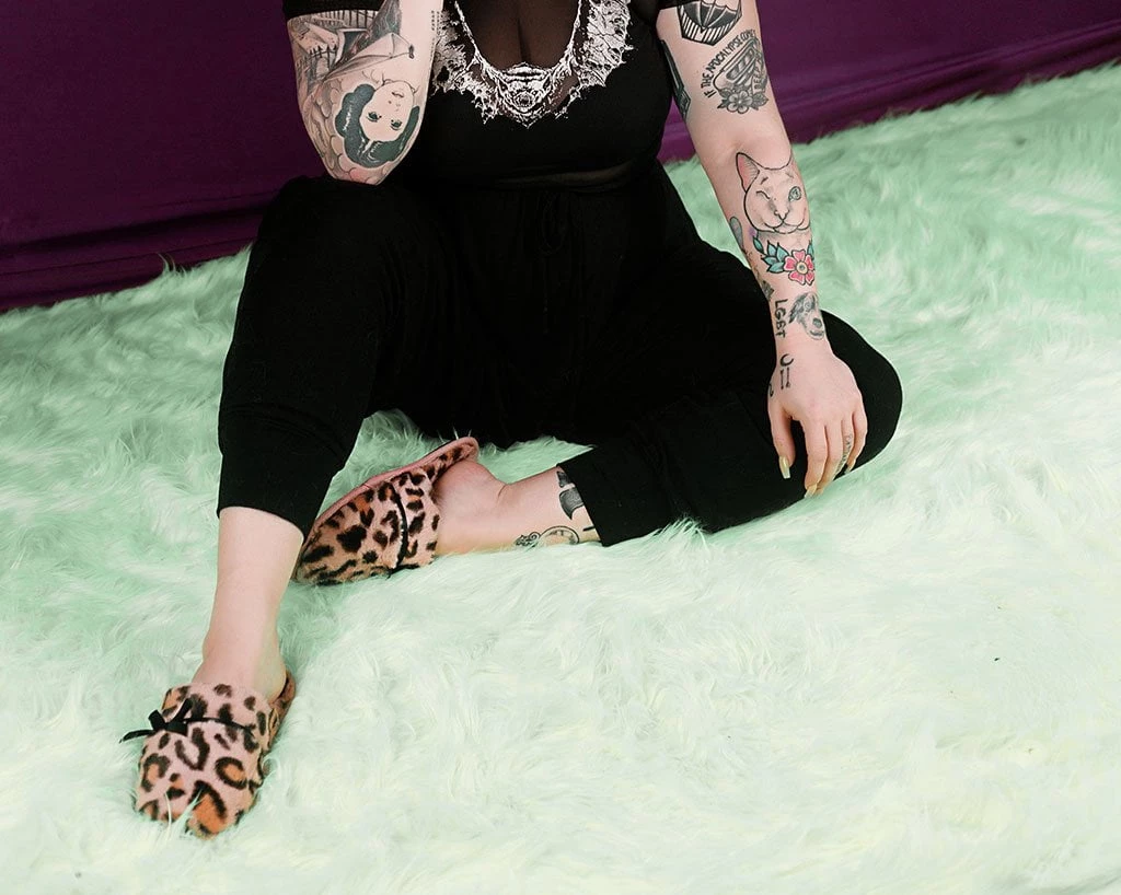 Fun and fuzzy for your feet! Play up your wild side while lounging in these vegan-friendly pink leopard slippers. Topped off with a cute black bow trim to add a little sweetness to your hangin’ at home essentials. Features a soft medium pile faux fur upper, cozy-cushie footbed and black rubber sole.