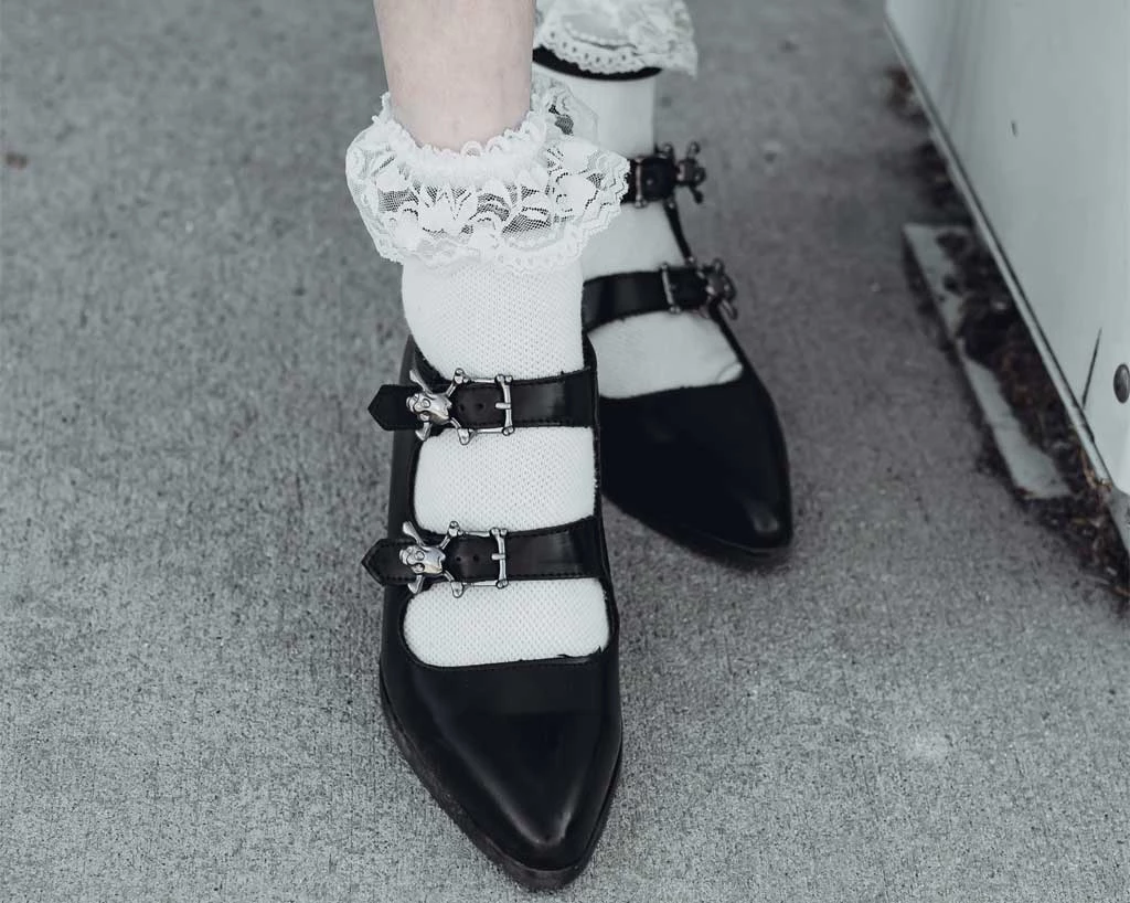 Black is our happy color. Features a vegan friendly black faux leather upper with a pointed toe construction and complemented by triple skull buckle straps. Has a block heel height of 2 ¼” and back zipper for easy on/off wear.