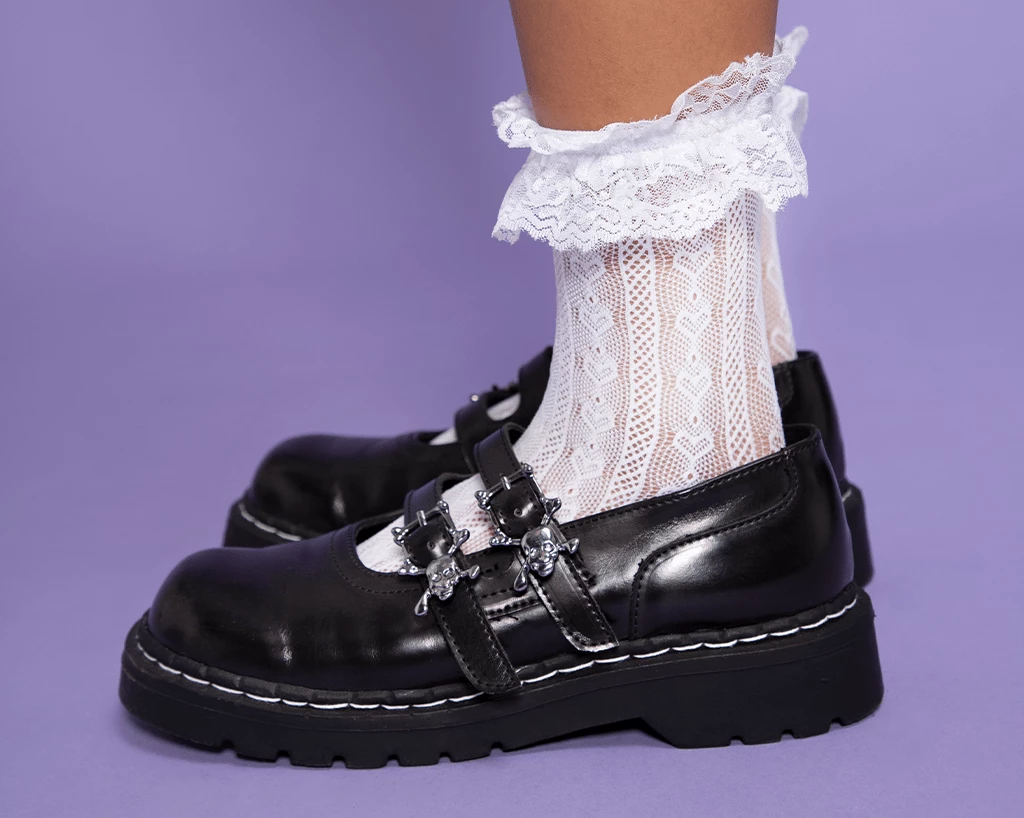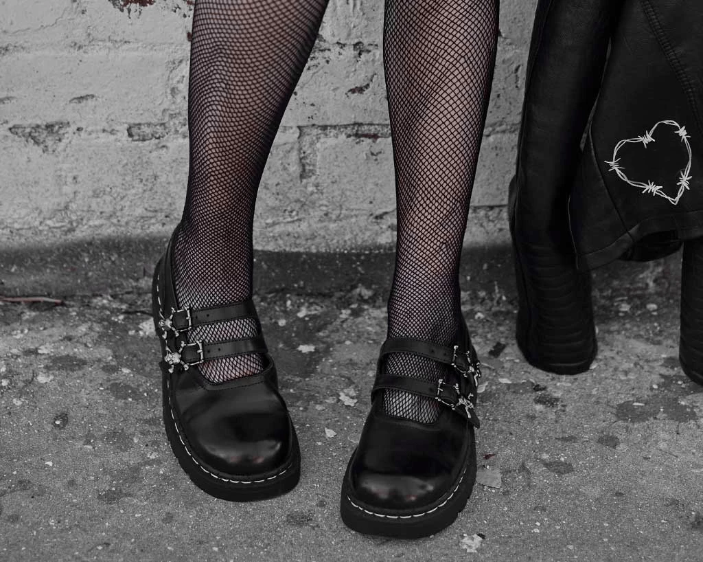 Take on the world in these killer Mary Janes. Features a double skull buckle closure and an all-black vegan friendly upper. Sits on top of a 1 ½” heel.Â