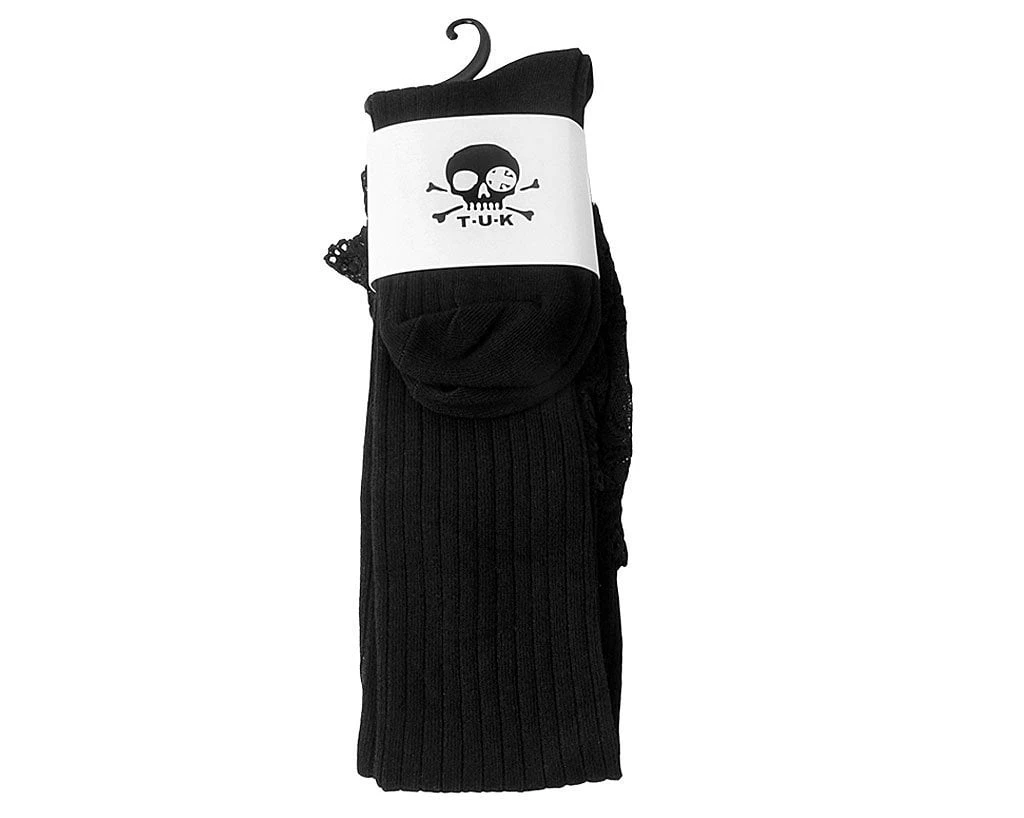 Classic black over the knee sock featured in a ribbed fabrication with a lace band hem for the perfect feminine touch.