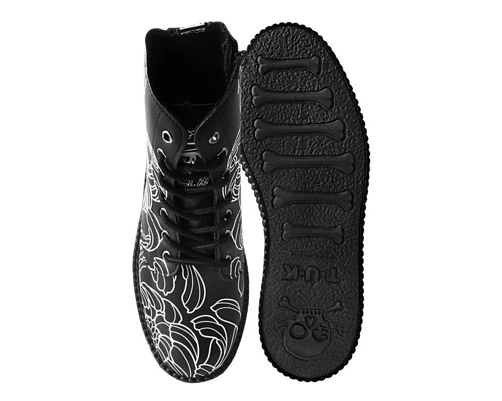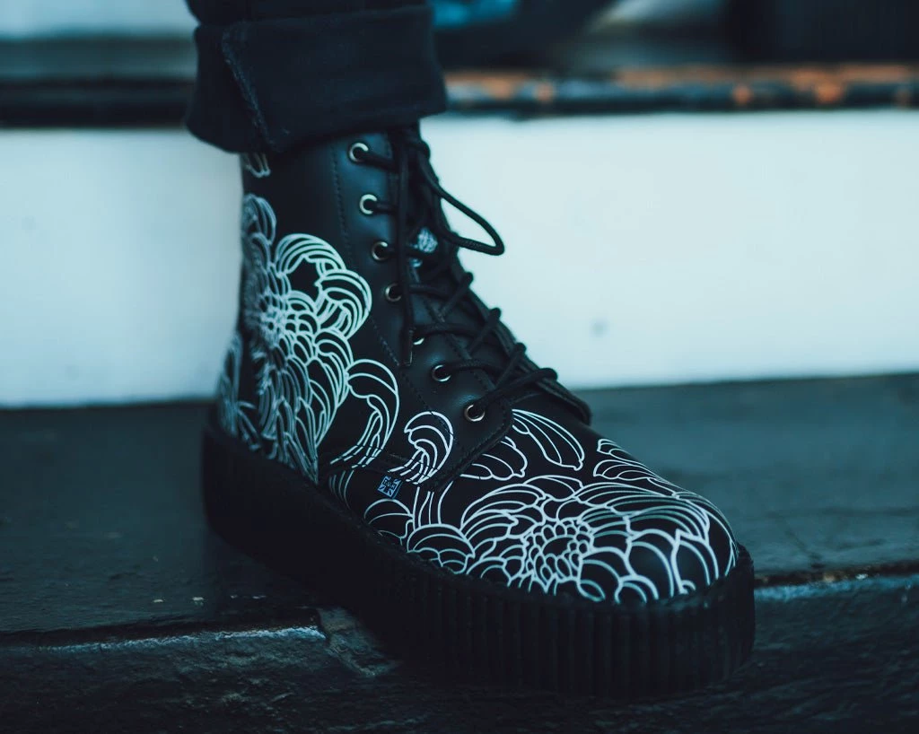 These T.U.K. x James Tran creeper boots feature a black faux leather upper with white chrysanthemums flower detailing. Has a lightweight VIVA mondo sole that is approximately 1 ¾” at the heel and 1 ¼” in the front. Has removable memory foam padding for added comfort.