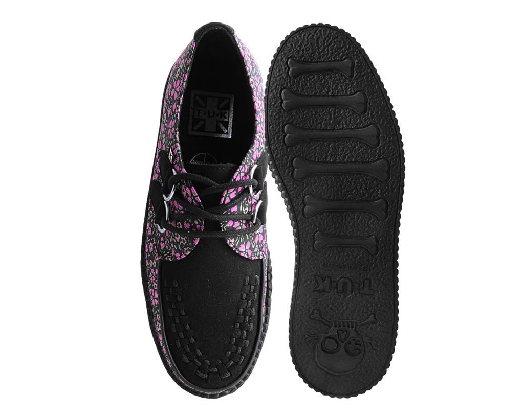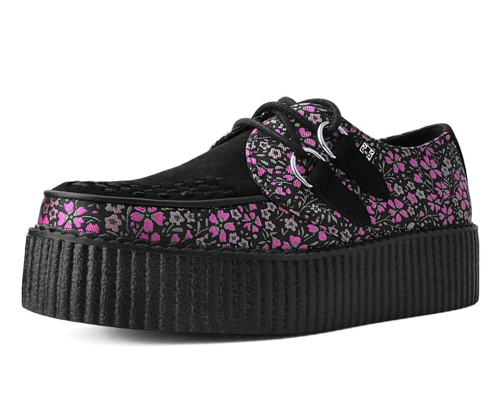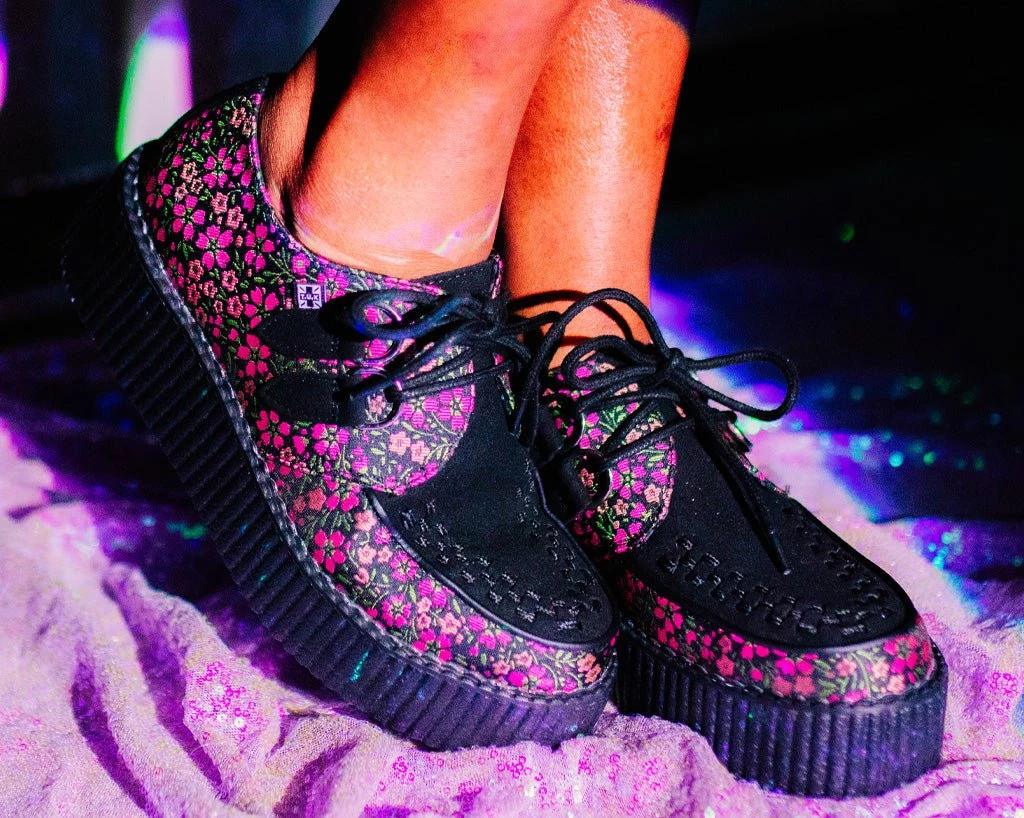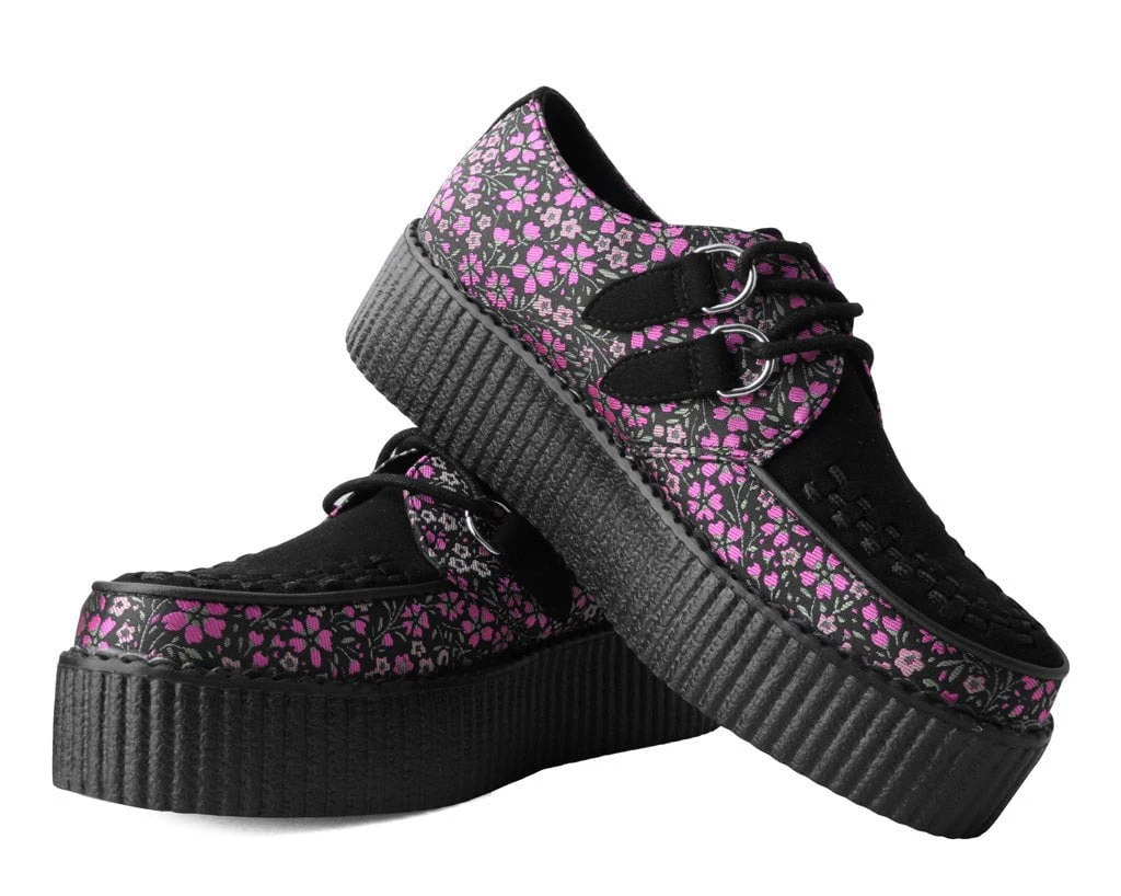 New shoes in bloom. Our lightweight Viva mondo sole is approximately 1 3/4” at the heel and 1 1/4” in the front. Has removable memory foam insoles for added comfort. Features microfiber on the vamp and a floral fabric upper. These round toe creepers have silver metal D-rings and features our patented T.U.K. Skull n’ Bones creeper sole design.